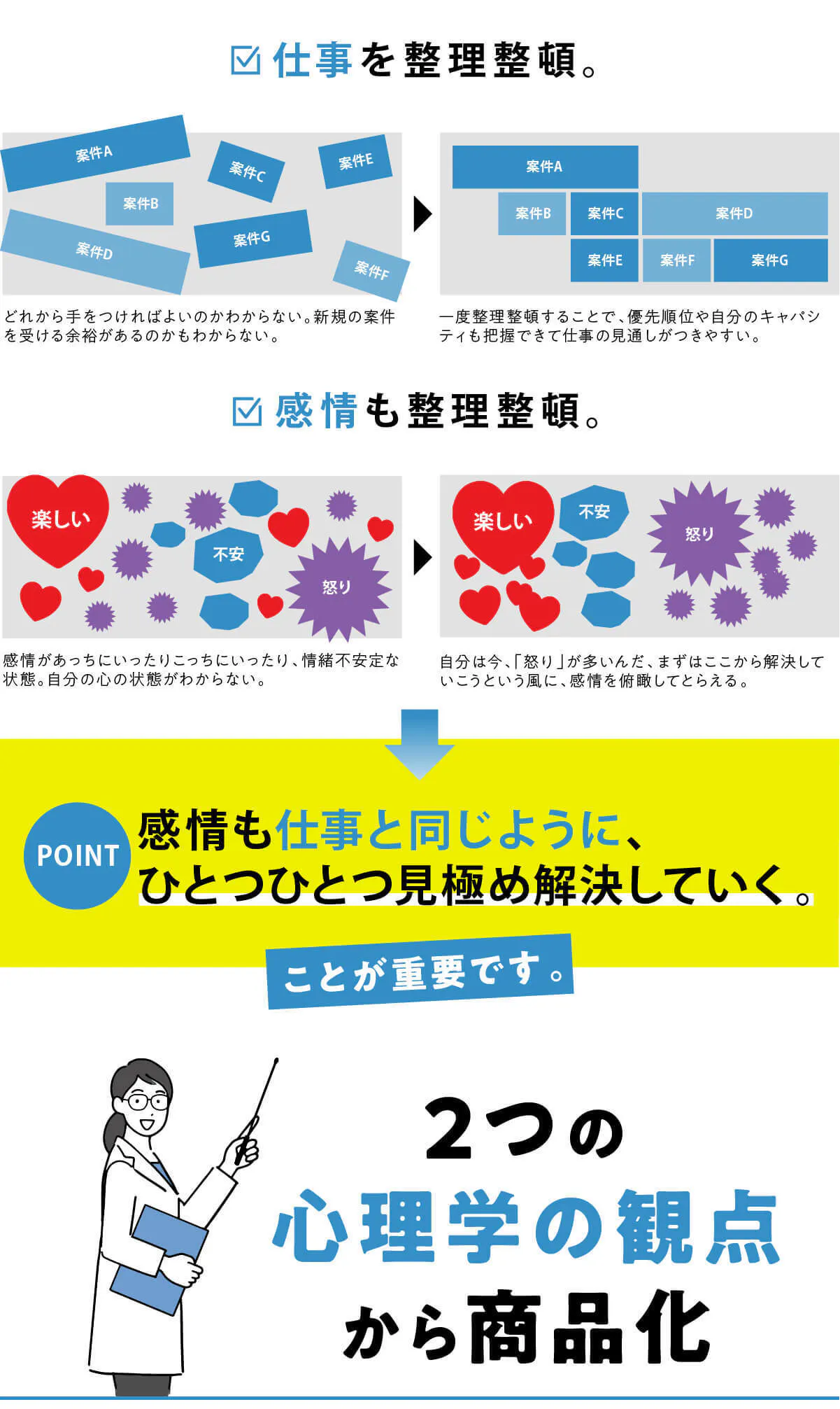 どちらの方にも私たちはこの"スッキリ箱”の使用をおすすめいたします。当商品の目的はストレスを治療することではなく、自分の感情を吐き出す習慣をつけること。"スッキリ箱”の真髄は「自分自身の感情を客観的に理解すること」です。