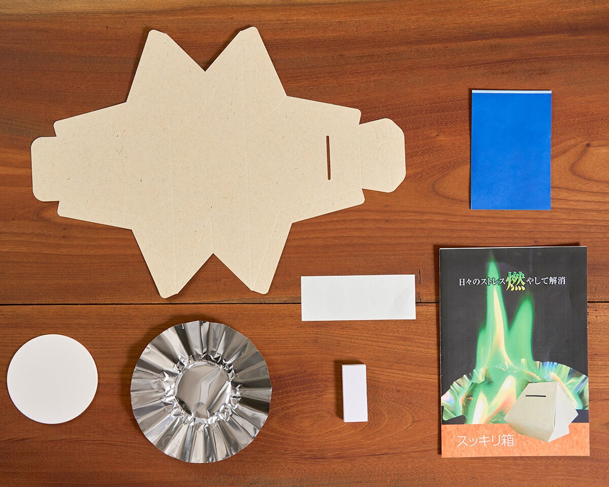 「スッキリ箱」セット内容緑色の炎をあげる「つぶやき用紙」と専用のシークレットボックス、着火用台座がセットに。