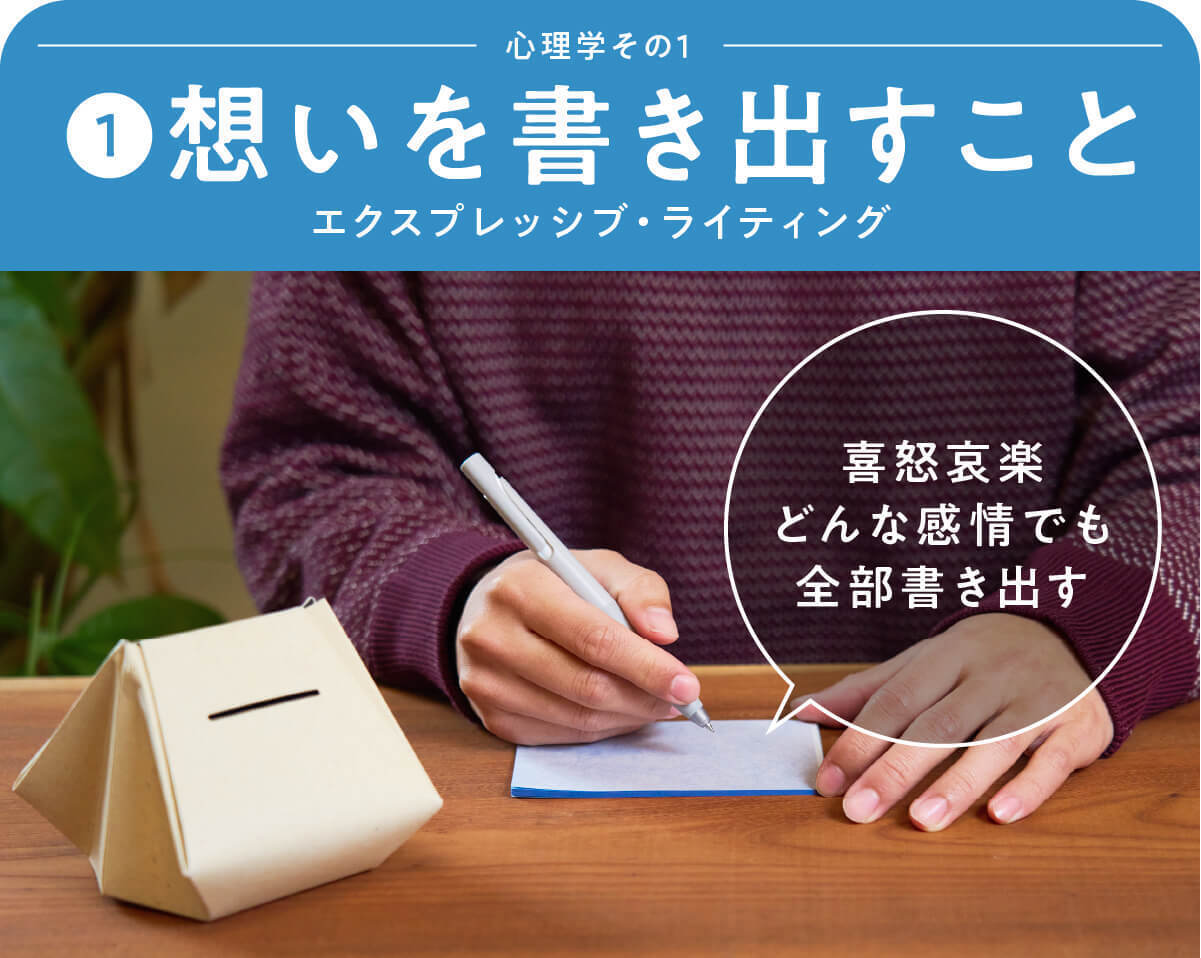 そういったこともなく一番心が晴れていったのが「エクスプレッシブ・ライティング」。スッキリ箱の元となった方法です。気持ちを包み隠さず紙に書き出して整理する、とてもシンプルな方法です。私はとにかくたまっていたうっぷんを書き出しました。A4ノート5冊分くらいは書き出しましたね。