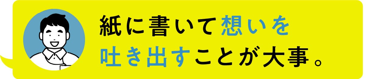 「つぶやき用紙」。専用の紙の名前の通りSNSでつぶやくように、軽い気持ちで書き殴ってください。文章になっていなくてもかまいません。まずは1枚書いてみましょう。手軽さは一緒なのに、そこには友人も先輩もネット友達もいません。自分だけの世界でコンプライアンスやプライバシーを一切気にせず100%自分自身を開放してあげてください(笑)