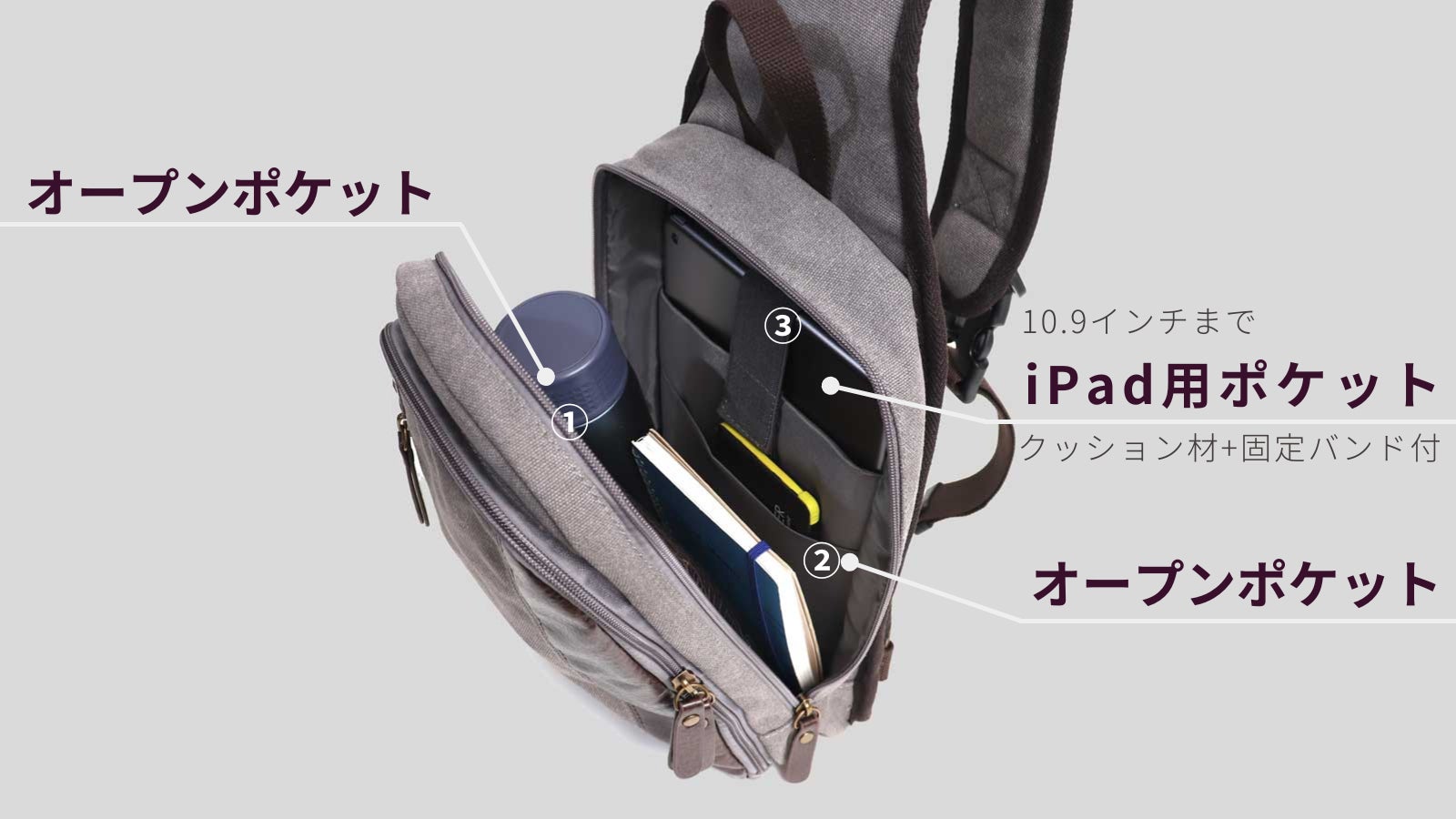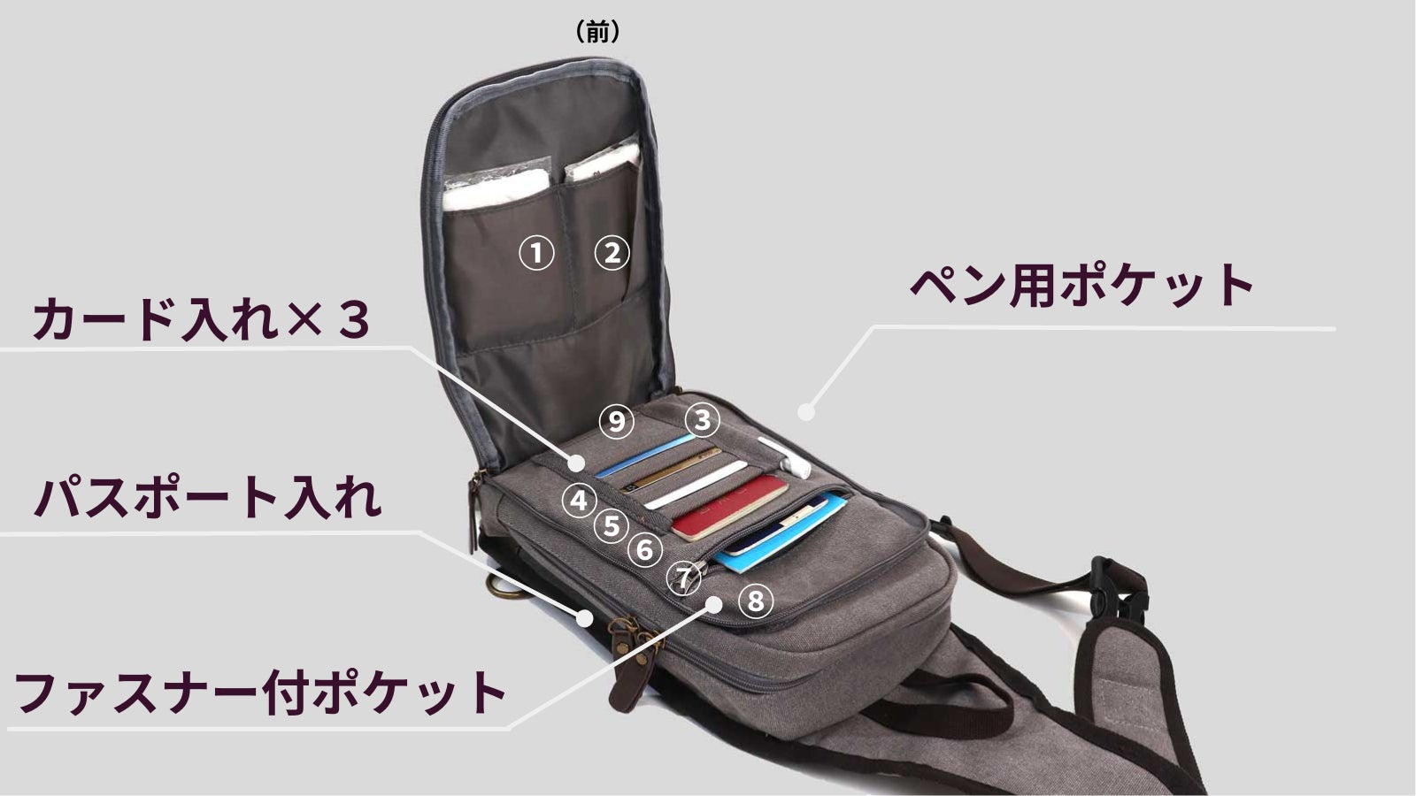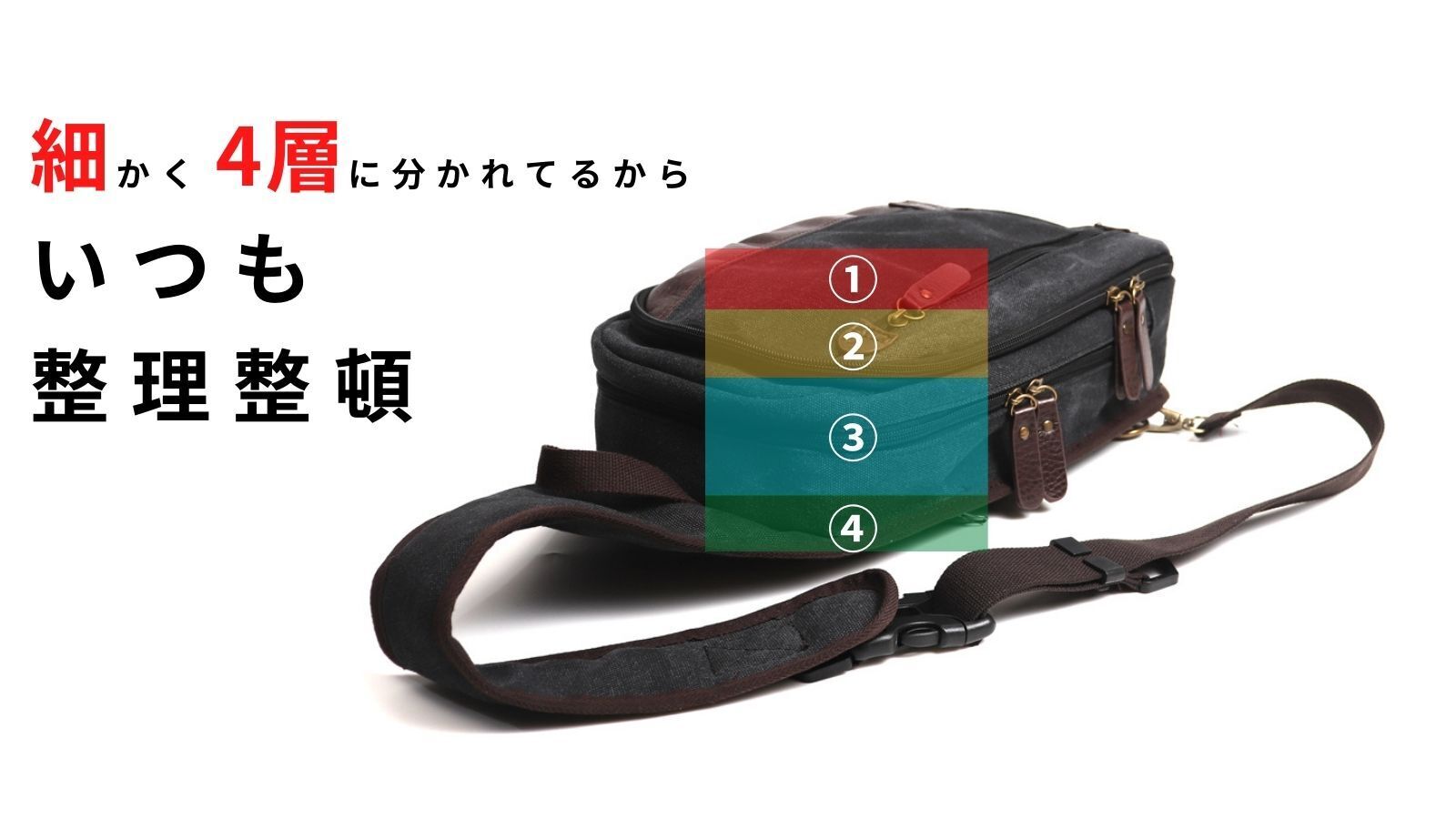 スマホ・ガジェットに即アクセス。分別整頓できる4層構造!軽量帆布ショルダーバッグ