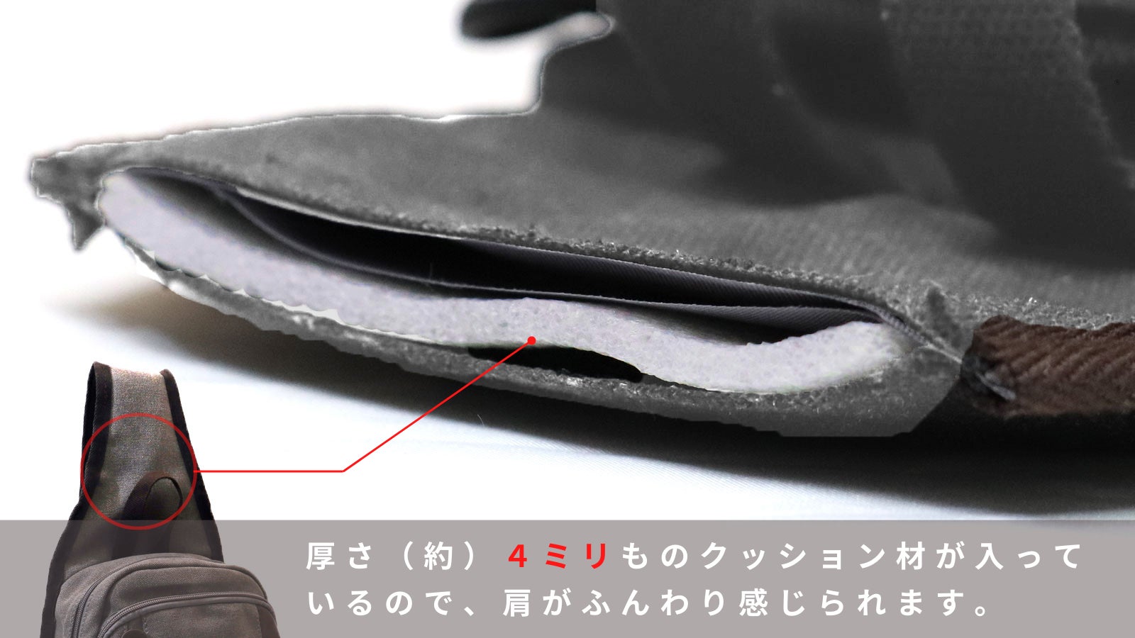 ベルトが細い線だと肩に食い込み、重みを感じてしまいます。そこで、肩と面で触れるよう幅広に設計しました。
