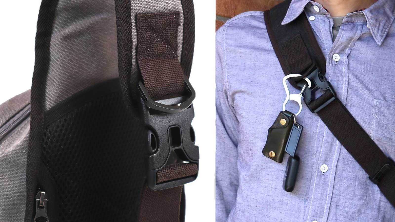 カギなど一時的に掛けておける便利なD型パーツを胸元に設置。