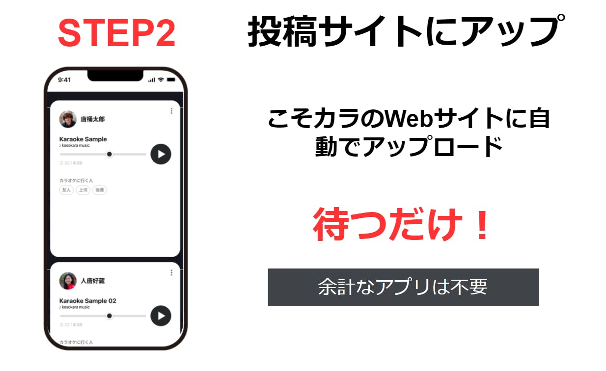 ボイストレーニングで練習したりやカラオケアプリで音程を合わせながら歌ったりするのではなく、カラオケを克服したい人や克服を応援してくれる人に気軽に自分の歌声をチェックしてもらうことができます。