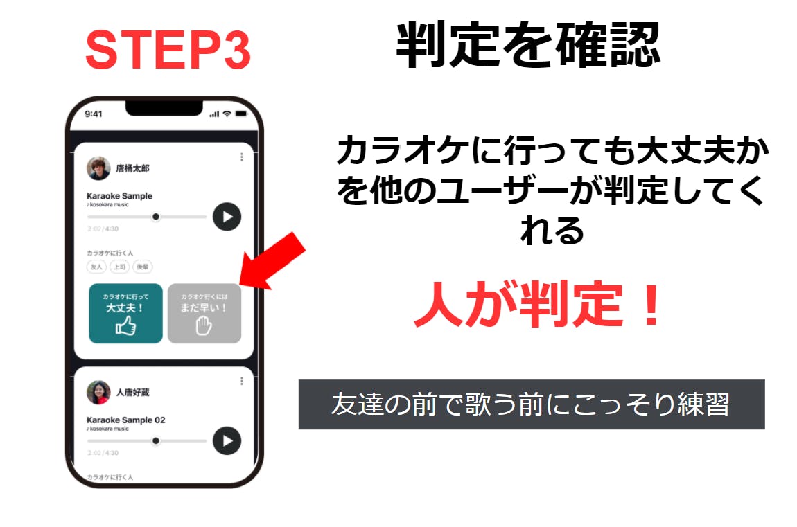 2. ほかの人の歌声に対して「カラオケに行って大丈夫!」「まだ早い!」ボタンを押す
