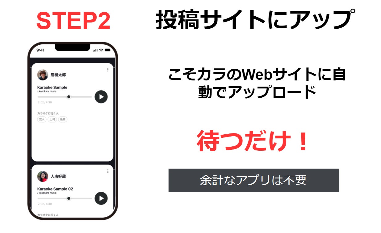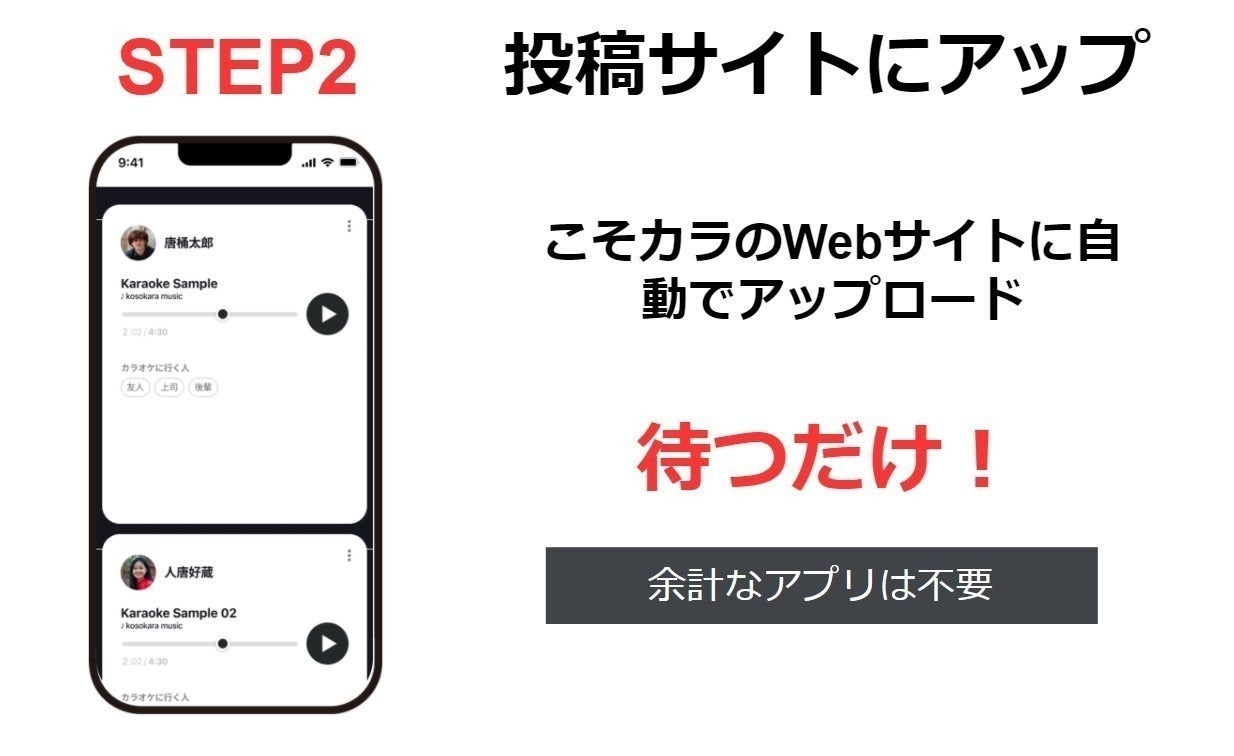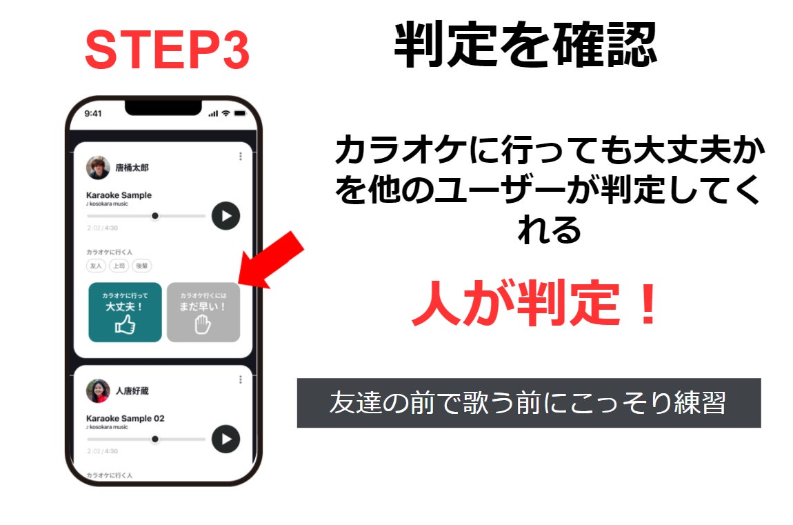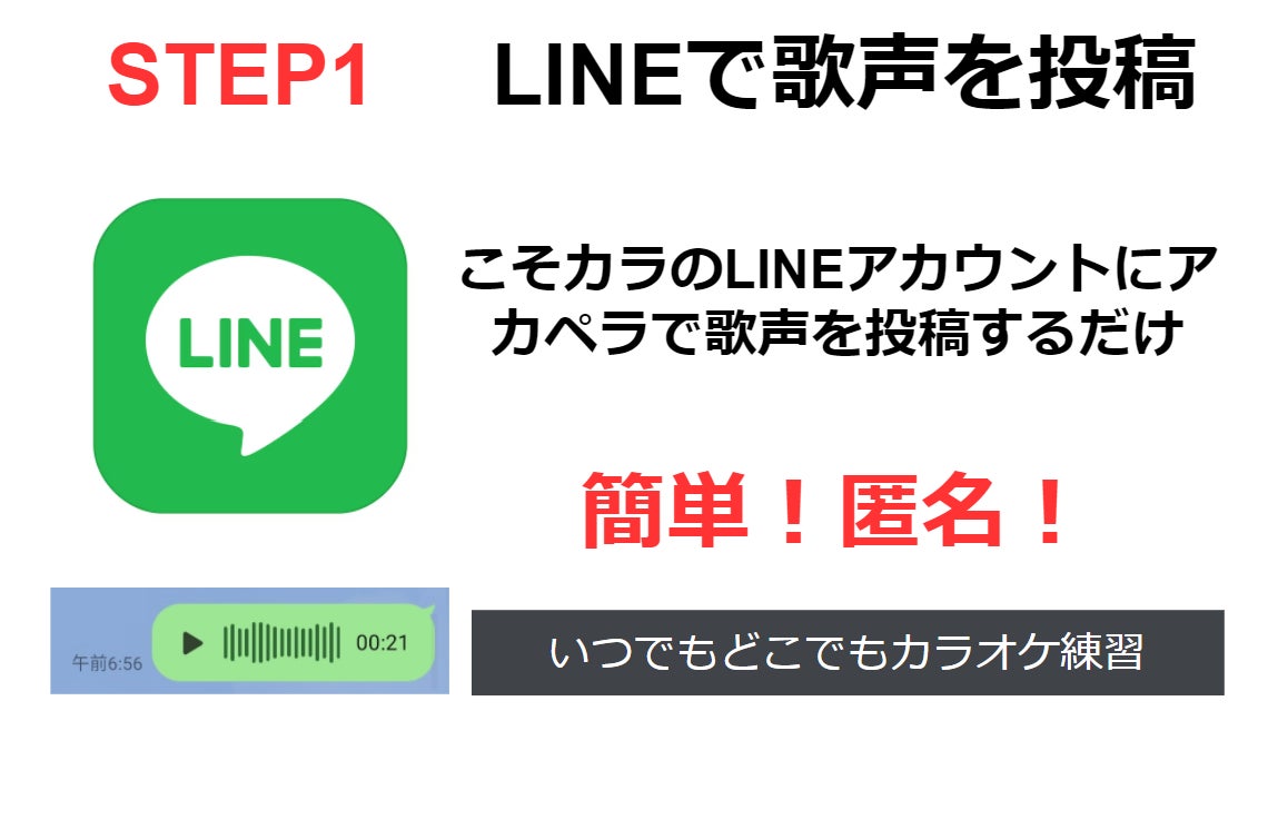 ボイストレーニングで練習したりやカラオケアプリで音程を合わせながら歌ったりするのではなく、カラオケを克服したい人や克服を応援してくれる人に気軽に自分の歌声をチェックしてもらうことができます。