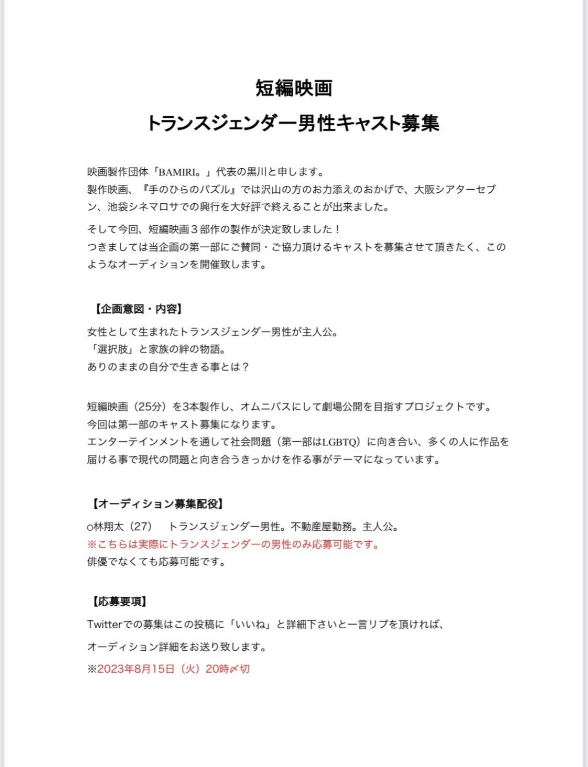 去年の夏にトランスジェンダー当事者役をX(旧Twitter)で一般公募しました。