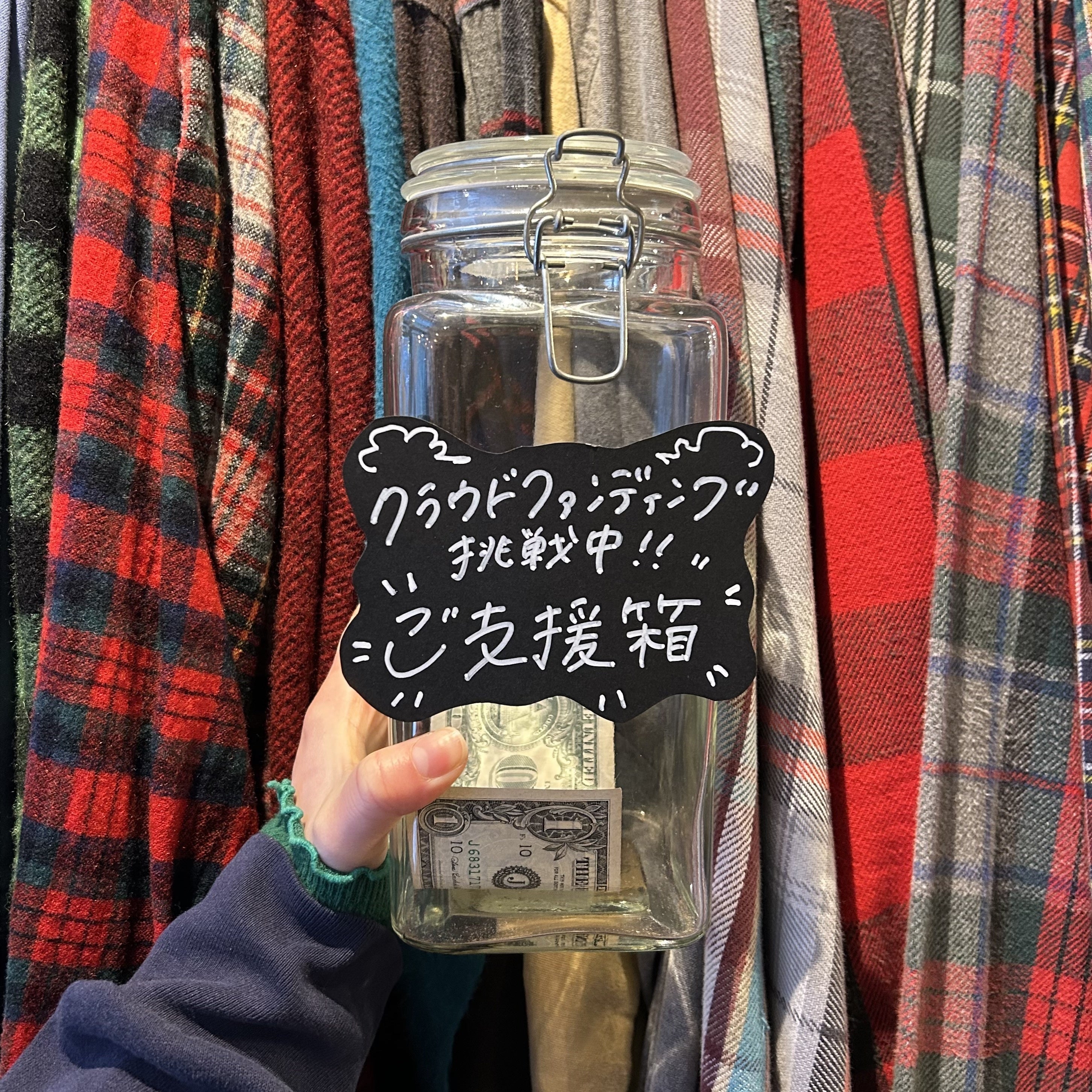 サイトへの登録をされていない、まだ学生だからネットの登録はちょっと、そんな方に向けて店頭でご支援の受付を開始いたしました。愛のドル札が目印です。こちらは現金のみの受付となります。また、リターンはご選択いただけませんのでご了承くださいませ。こちらに入れていただいたお気持ちは、責任を持って代理で申請させていただきますのでご安心ください!早速お持ちくださった方もいらっしゃって、感謝でいっぱいです。そして100円からお預かり可能ですのでお気軽にスタッフまでお申し付けくださいませ!今日から2月、クラファンも今月いっぱい!駆け抜けますので応援よろしくお願いいたします!