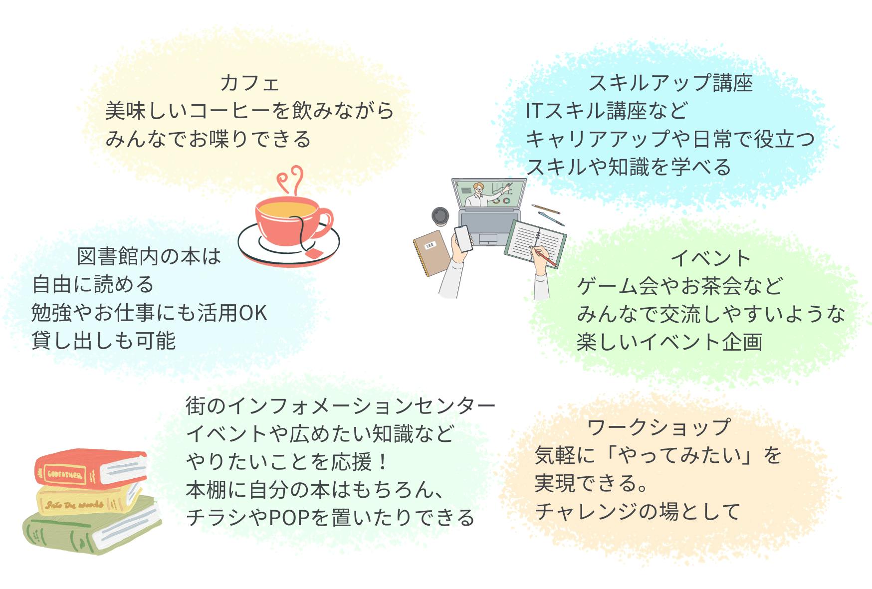 この図書館は、「学び」に特化した場所で、知らないものに出会いながらステップアップしていくきっかけの場になることを目指しています。