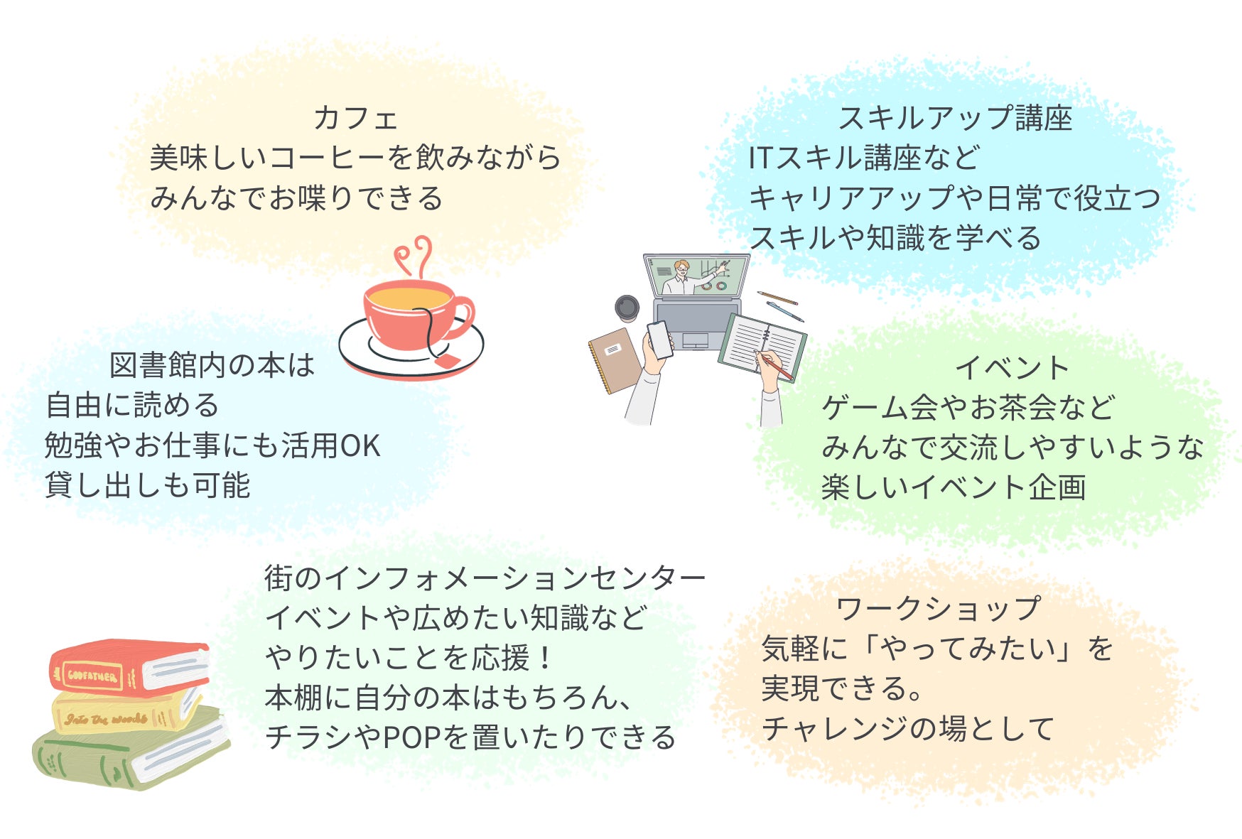 この図書館は、「学び」に特化した場所で、知らないものに出会いながらステップアップしていくきっかけの場になることを目指しています。