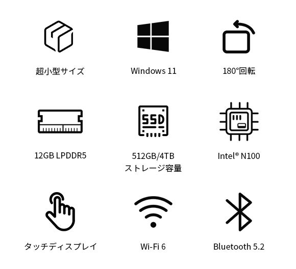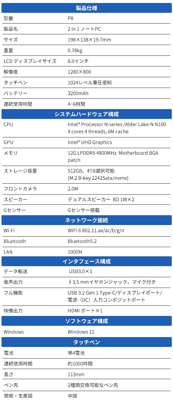 約780gと超軽量、8インチのフルタッチディスプレイを搭載し、CPUには低消費電力のIntel N100を採用しています。
