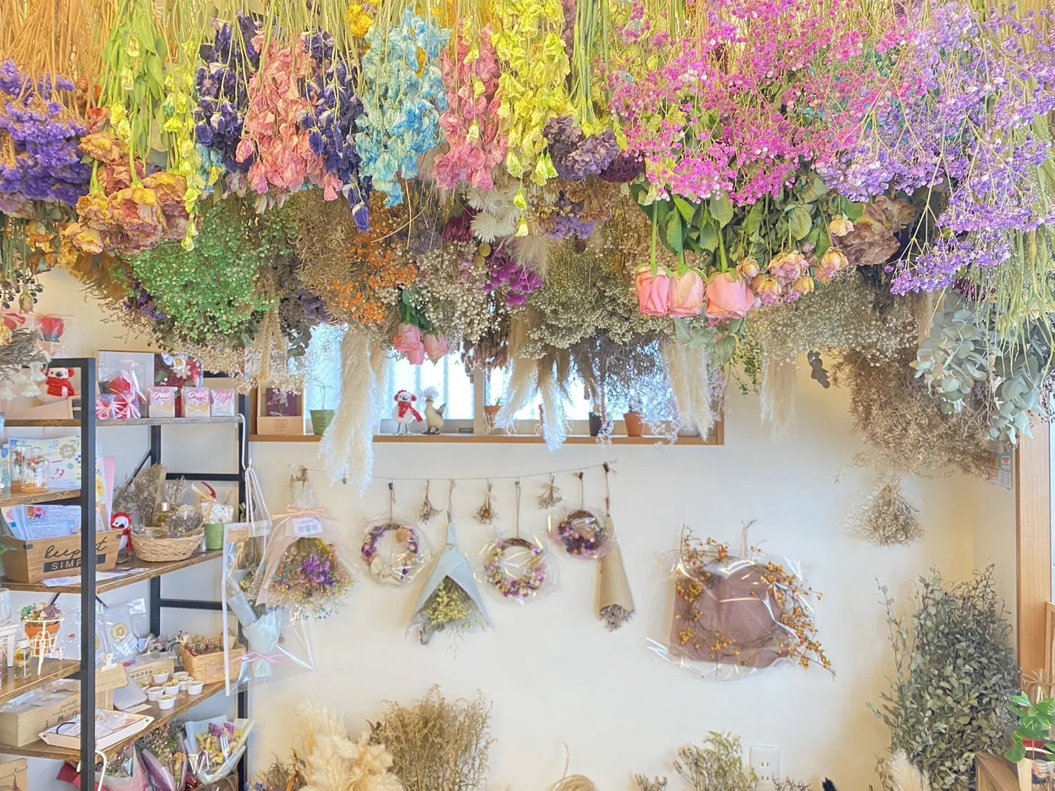 お店では、生花や手作りのドライフラワーブーケ、ハ―バリウムボールペン、ドライフラワーの雑貨類を販売しております。
