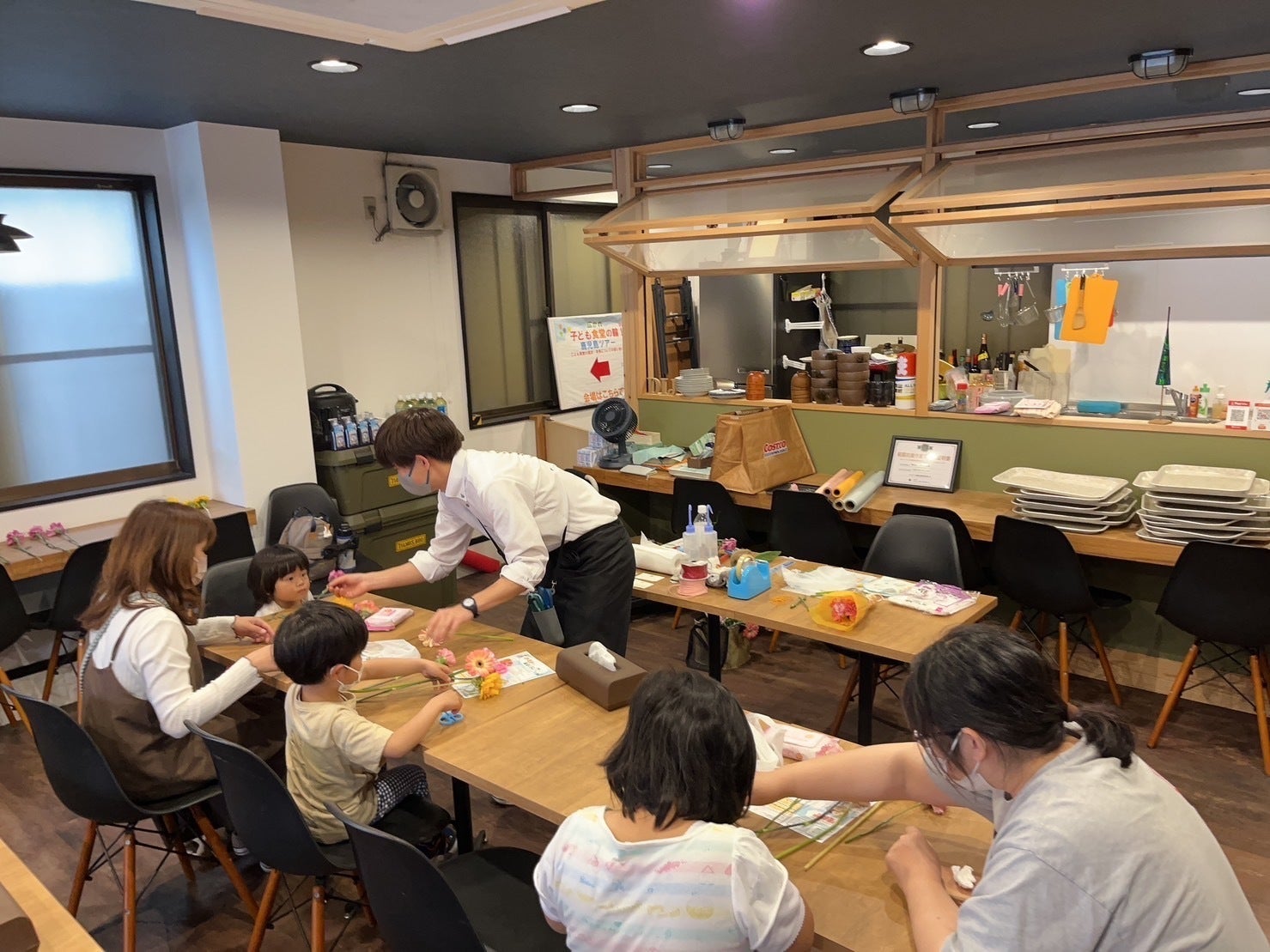 鹿児島市内で運営されている子ども食堂のスペースをお借りし、小学生約10名と一緒に母の日に合わせて「ミニ花束作り」を実施。