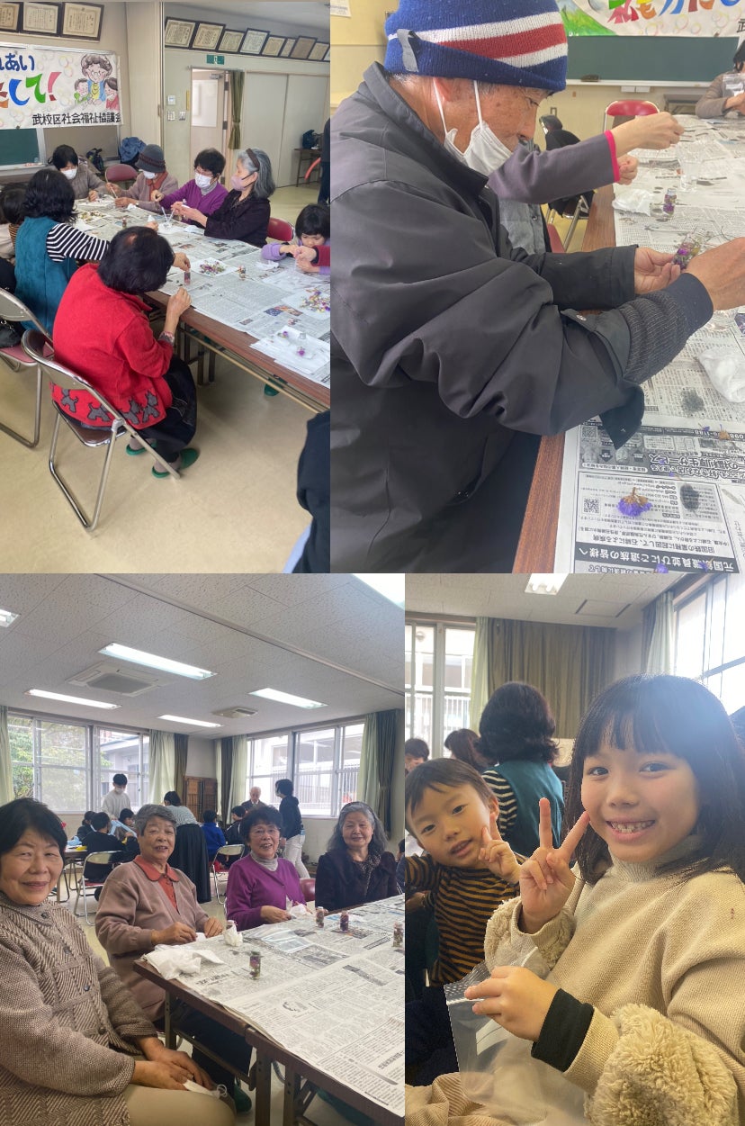 鹿児島市内の公民館へ出向き、幅広い世代を対象としたハ―バリウム作りを実施。(ロスフラワーを活用)