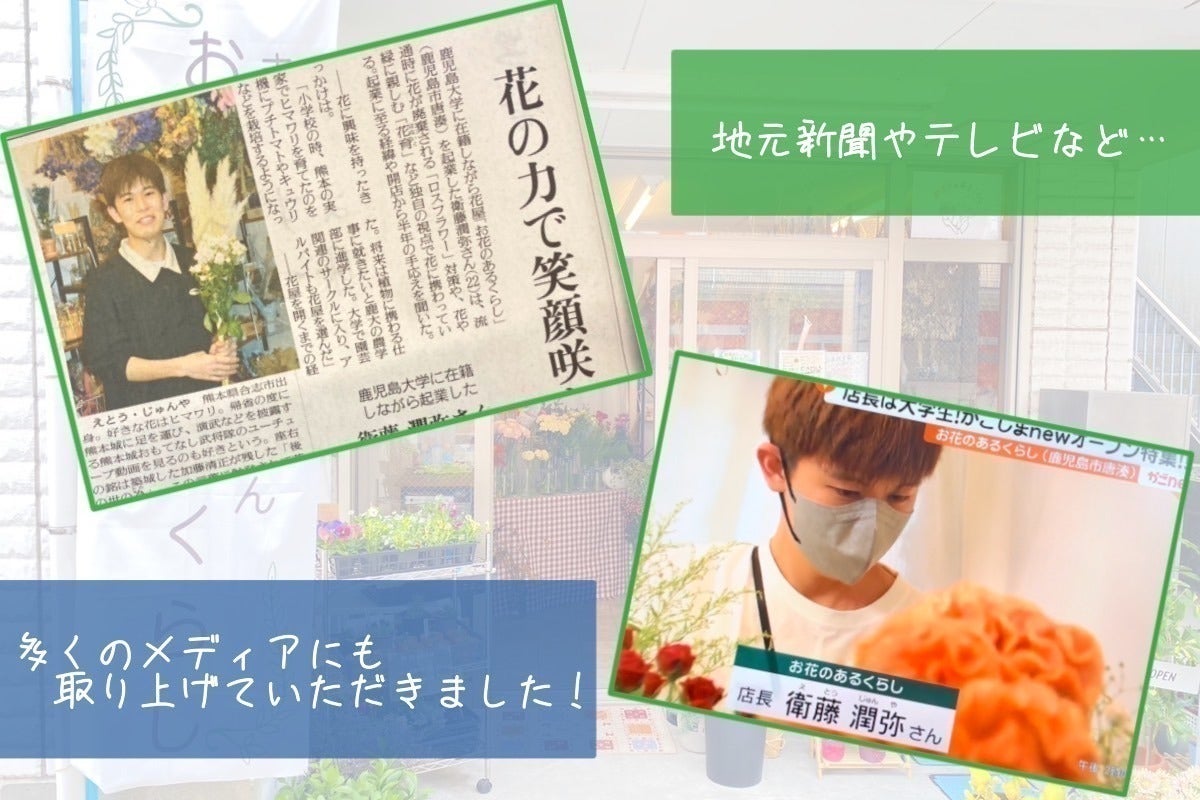 (2024年2月)2023年4月から1年間大学を休学し、2023年6月鹿児島市にて「お花のあるくらし」という小さな花屋を1人で開業いたしました。気軽に立ち寄れる花屋さんを目指して、生花や手作りのドライフラワー雑貨等を可能な限り低価格で販売しております。