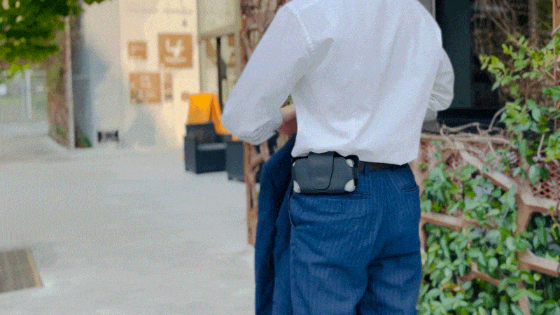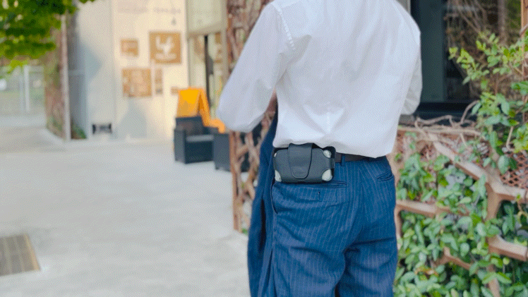 そして、完成したサンプルを複数のスタッフが実際に腰にセットした状態で、仕事をしたり、改札を通ったり、自販機で缶コーヒーを購入してみたり、実際にビジネスマンのライフスタイルに沿って使用感を試してみたところ、着脱が簡単でスマホの持ち運びが非常に容易である一方で、いざスマホを取り出そうとした際に、スムーズに取り出せずに手間取ってしまう…ということが分かりました。