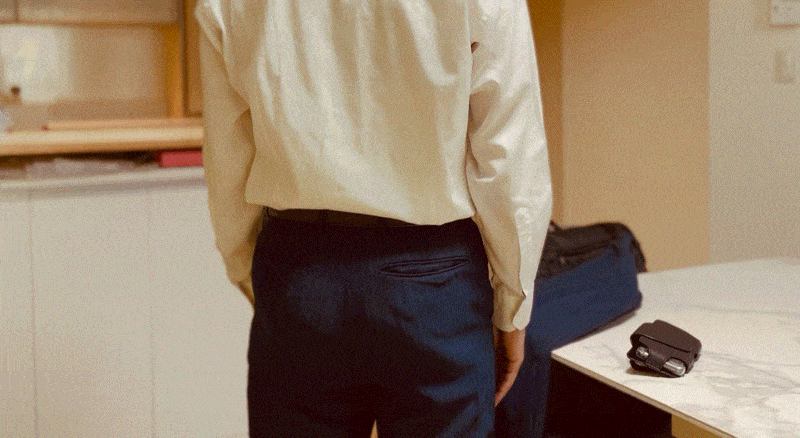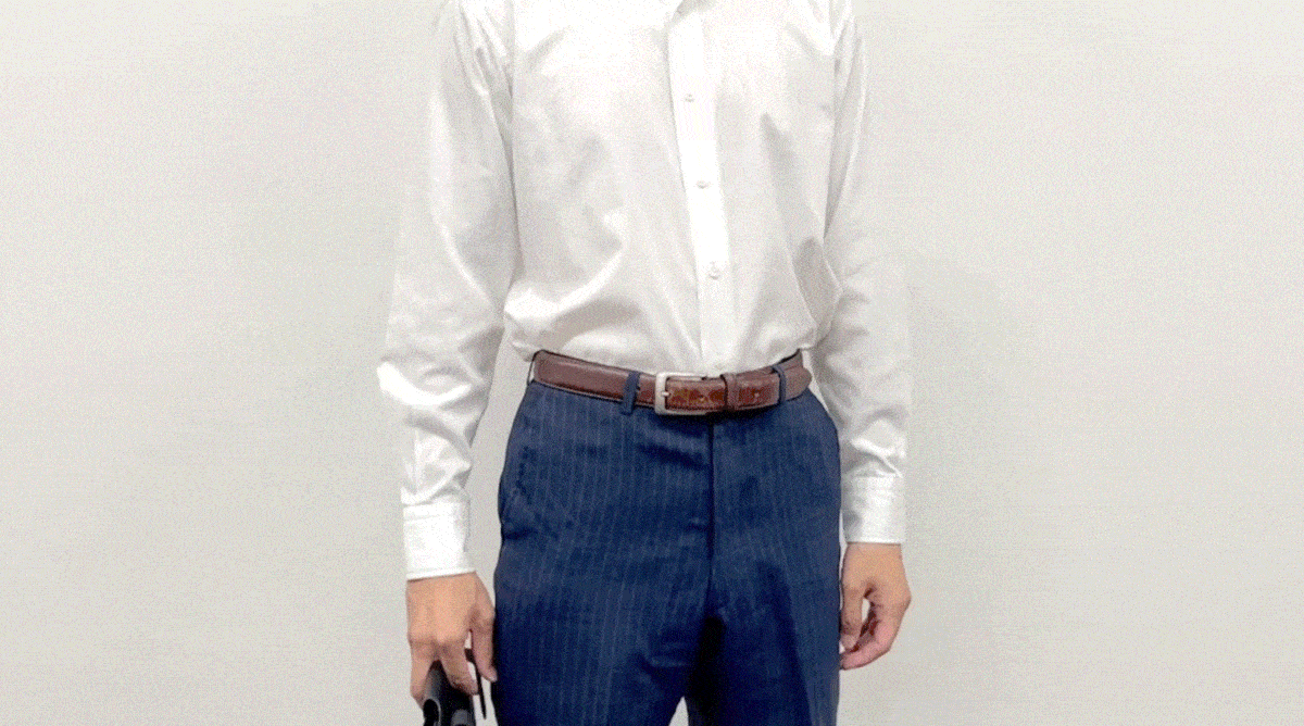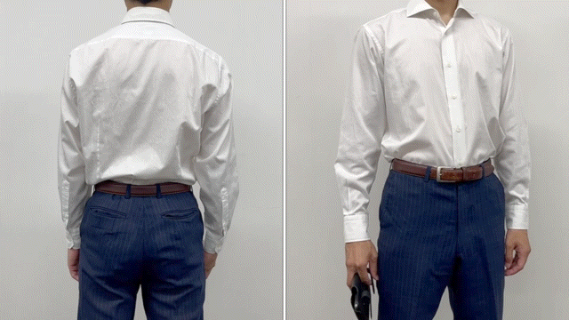 丈のあるシャツなら、上からシャツで隠すことも可能。超薄型なので、ウエストポーチのような野暮ったい感じもありません。
