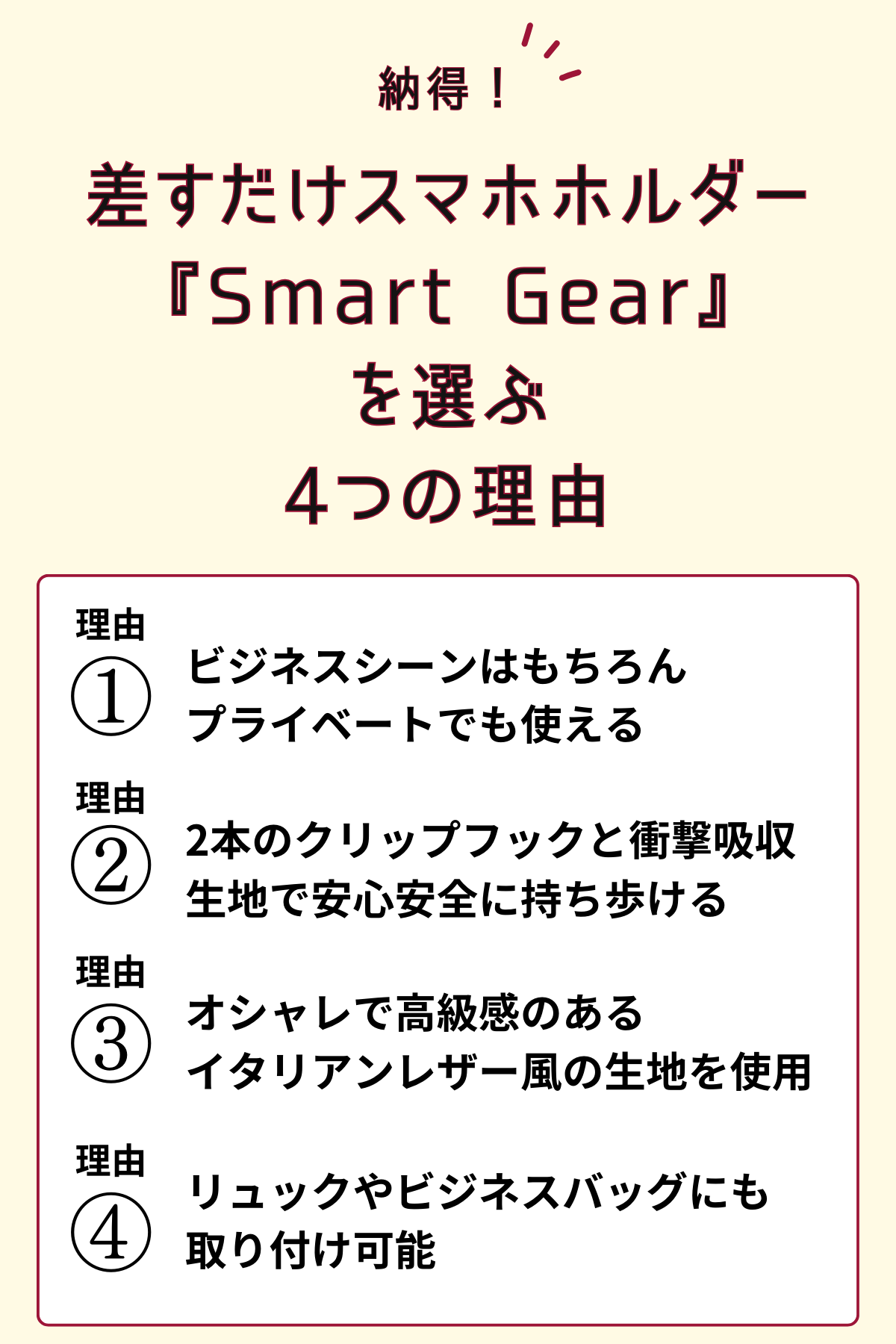 なので、ビジネスシーンはもちろん、プライベートでも、スマホをポケットに入れずに、簡単に手軽にスマートにスマホを持ち歩くことができます。