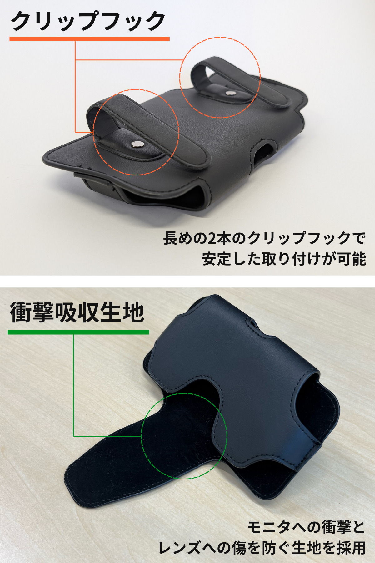 また、ホルダーの内部には、スマホのモニタへの衝撃と、カメラのレンズへの傷を防ぐ衝撃吸収生地を採用。あなたの大切なスマホを安心安全に持ち歩くことができます。
