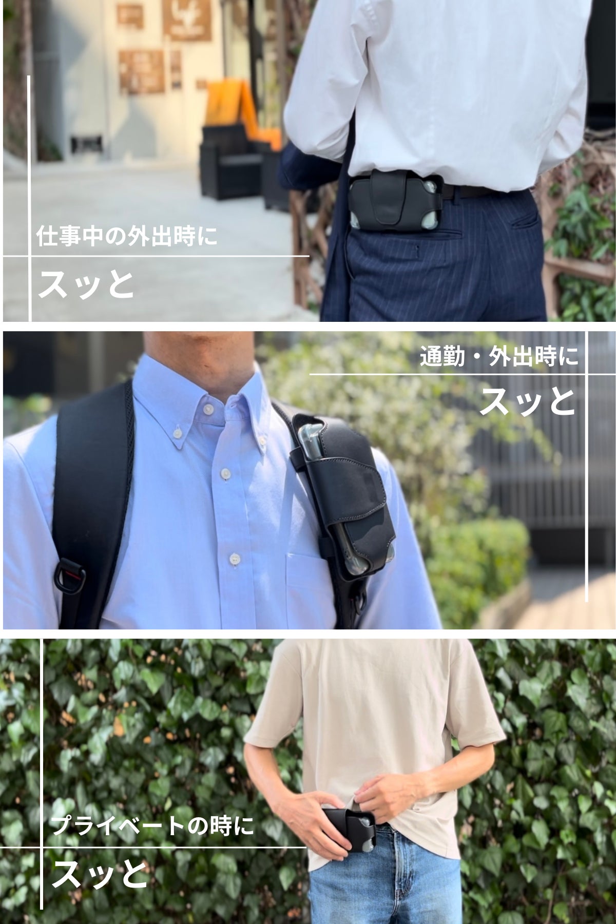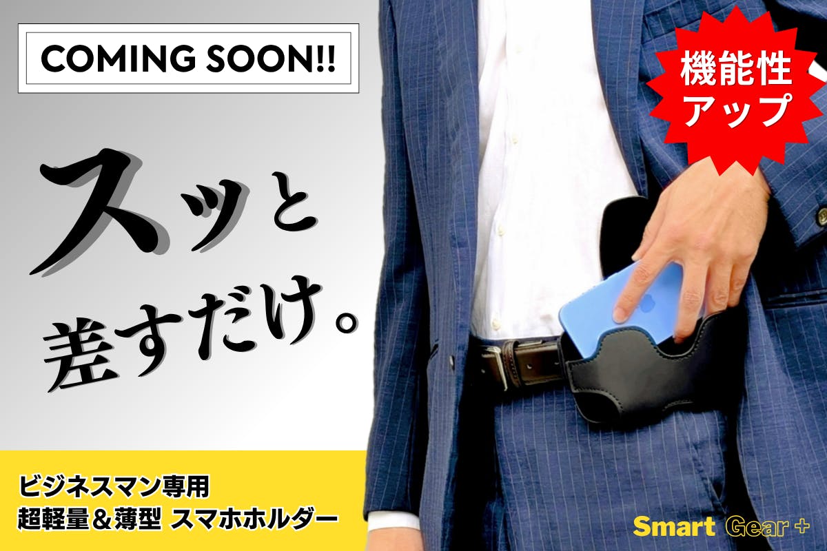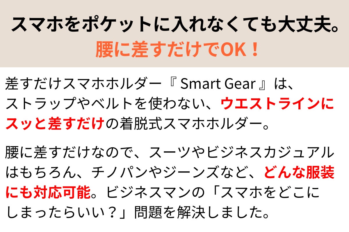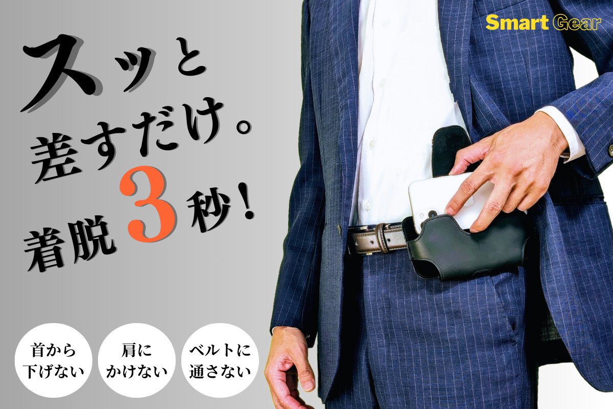 ウエスト部分に差すだけで、スマホを「手ぶら」で「スマート」に持ち運べる、ビジネスマン専用のスマホホルダーが誕生!