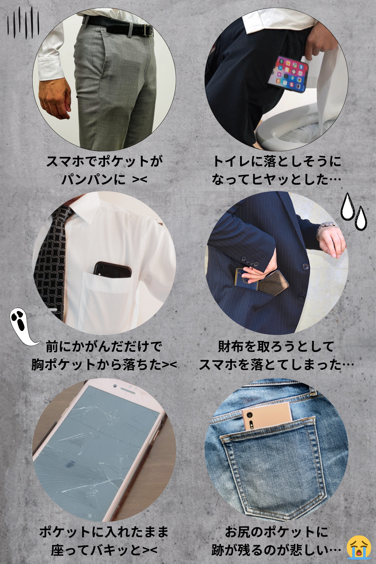 しかし、スマホをポケットに入れると、ポケットがパンパンに膨れてしまい、せっかくのスーツが型崩れしたり、体勢を変えた瞬間に飛び出てスマホを地面に落としたり、ポケット入れたままでいることを忘れて座って画面が割れてしまうことも…