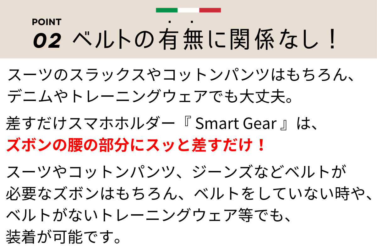 ベルトが必要なズボンでも、ベルトがないトレーニングウェアでも、どちらでも装着が可能です。