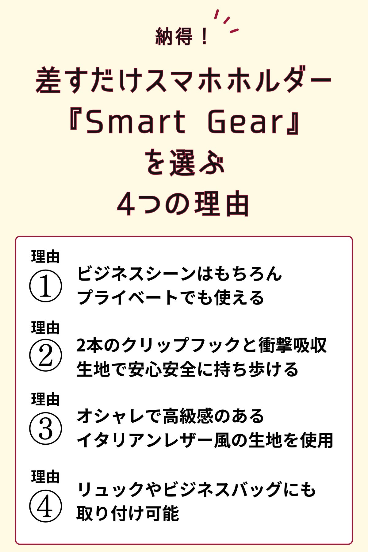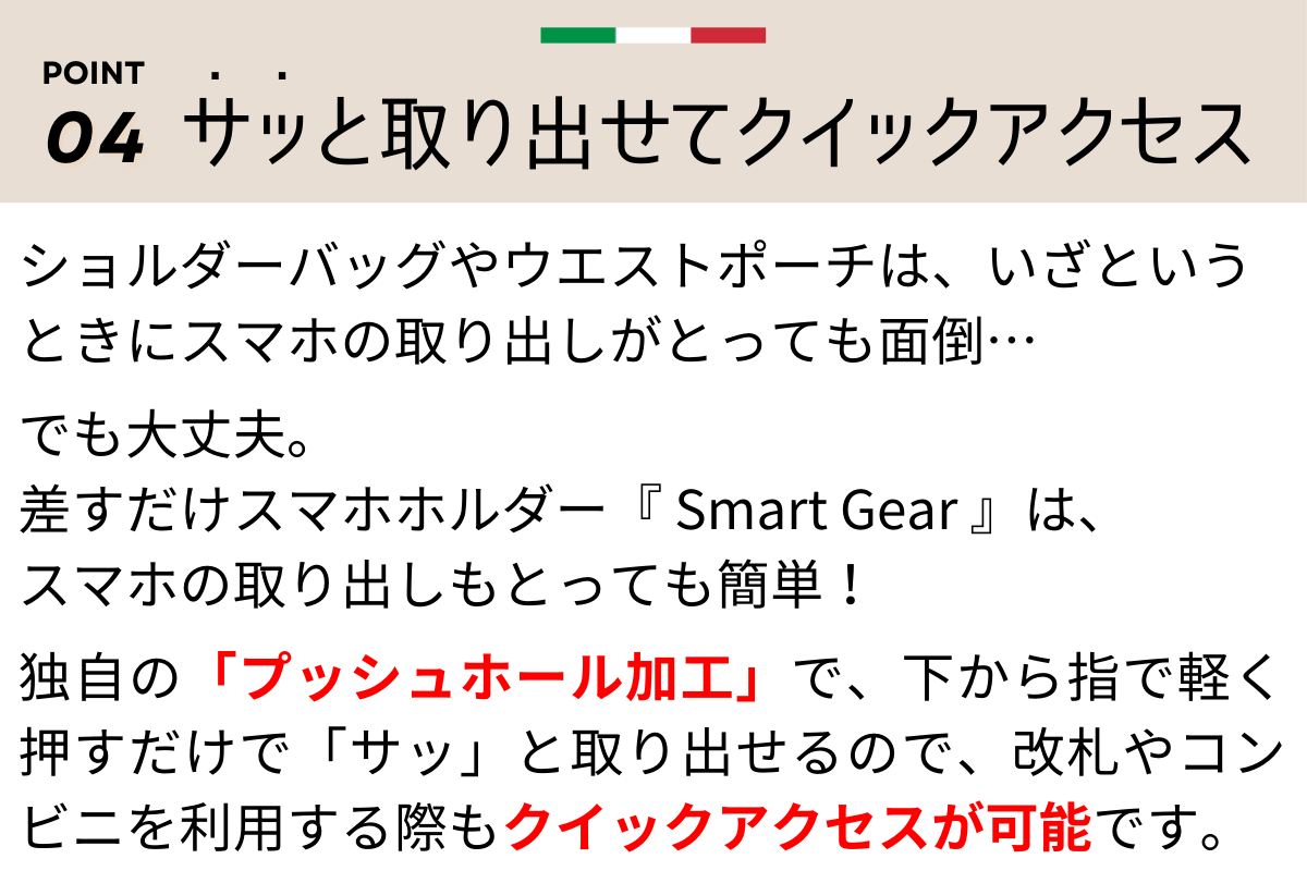 「収納の量」に焦点を当てたポーチや、「落下の衝撃」から守るスマホケースばかりがあふれる中で、意外にも「スマホを手軽にスマートに持ち歩く」ことに注目したスマホホルダーはありませんでした。