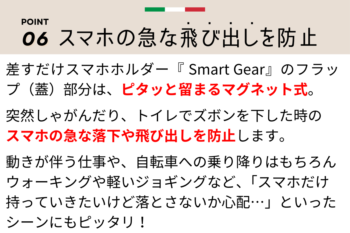 スマホに影響を与えないほどの微力な磁力のマグネットでも、フラップ(蓋)がピタッと留まるので、逆さにしても大丈夫。急にかがんだり、トイレでズボンを下ろした時のスマホの飛び出しや落下を防止します。