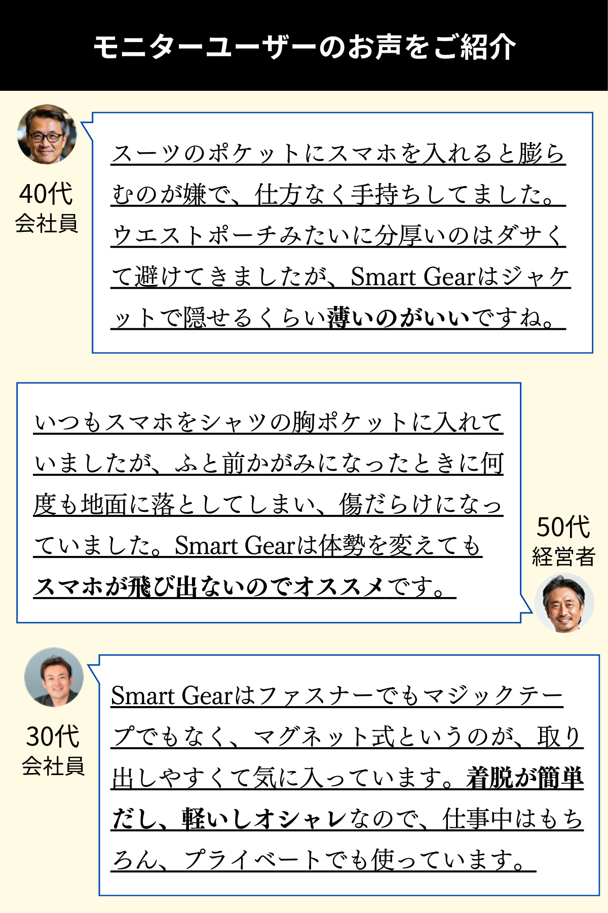 そんな働く男性の声を元に、私たちはビジネスシーンに合うスマートフォンホルダーの開発に着手し、スーツの胸ポケットや、ズボンの横や後ろのポケットなど、ビジネスマンのスマートフォンをしまう場所の悩みの解消を目指しました。