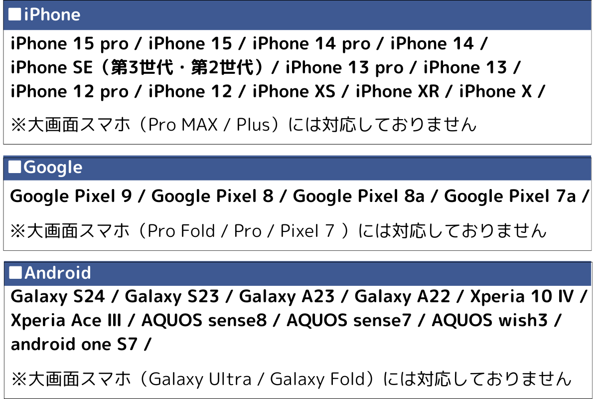 ※対応機種でも、分厚いスマホケースを使用されている場合には適応サイズを超えている場合がございます。