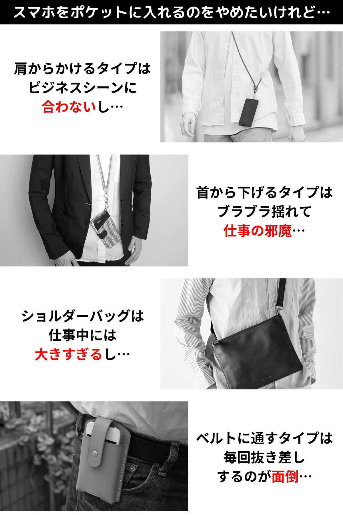 スマホを手にも持たず、ポケットにも入れずに、手軽にスマートに持ち歩きできる商品はないのか…