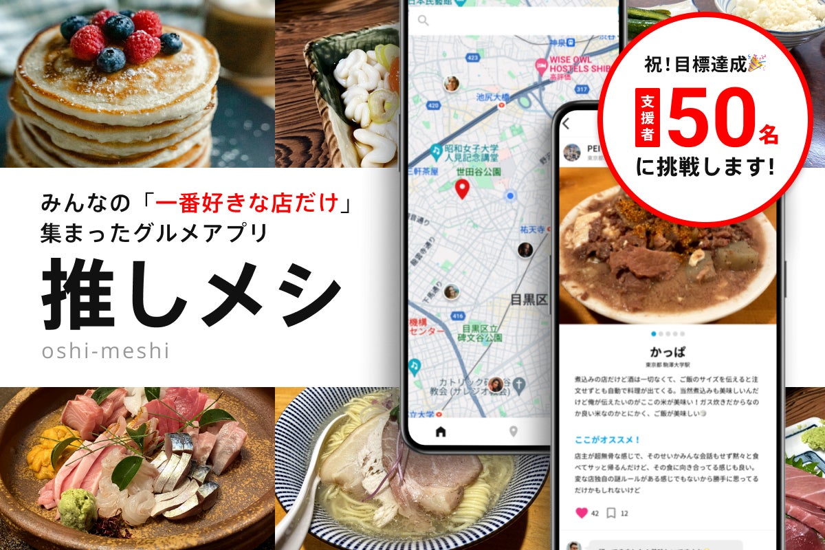 2024/03/17 10:59■祝!目標達成!次の目標として支援者50人に挑戦しますまずはご支援いただいた皆様、本当にありがとうございます!今後の「推しメシ」への期待して頂けてるということでリリースに向けて一層気合が入ります。推しメシはユーザ投稿が集まるほど価値が高まるアプリだと考えているので、リリースのスケジュールとは別に登録ユーザ数の目標を立てました!3月〜 クラウドファウンディング終了時 / 50人(支援者数)6月〜 限定公開アプリリリース / 100人9月〜 本番リリース / 500人12月〜 公開後3ヶ月 / 1000人まずは、クラウドファウンディング終了時に支援者数50人に挑戦したいと思いますので、引き続き開発と発信を頑張ってきますのでよろしくお願いします!皆様も良かったら拡散してくれると嬉しいです! もっと見る