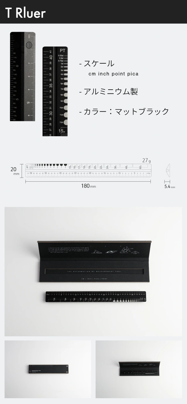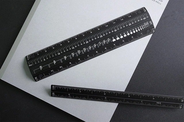 一般的な三角スケールには6種類の異なる縮尺の目盛りが刻まれていますが、T³ Rulerには12種類もの縮尺が搭載されています。また、T Rulerにはセンチメートル表記だけでなく、インチ・ポイント・パイカ表記に対応しており、1本4役で大活躍間違いなしの定規です。