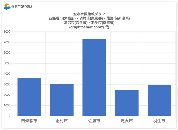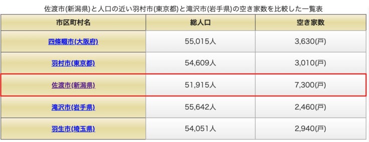 上記の空き家数の比較表をみてみると、佐渡市は、人口の近い羽村市(東京都)よりも空き家数の数値が約4,290も多く、2.425倍も高い。また佐渡市は滝沢市(岩手県)よりも空き家数の数値が約4,840も多く、2.967倍も高いという結果となっています。