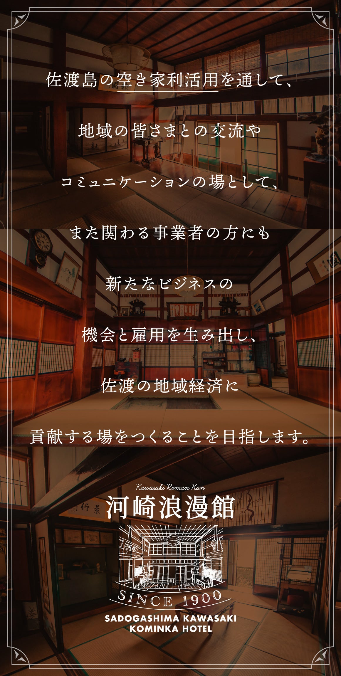 現在、佐渡島の空き家を利活用を通して、地域の皆さまとの交流やコミュニケーションの場として、また関わる事業者の方にも新たなビジネスの機会と雇用を生み出し、佐渡の地域経済に貢献する場をつくることを目指しております。