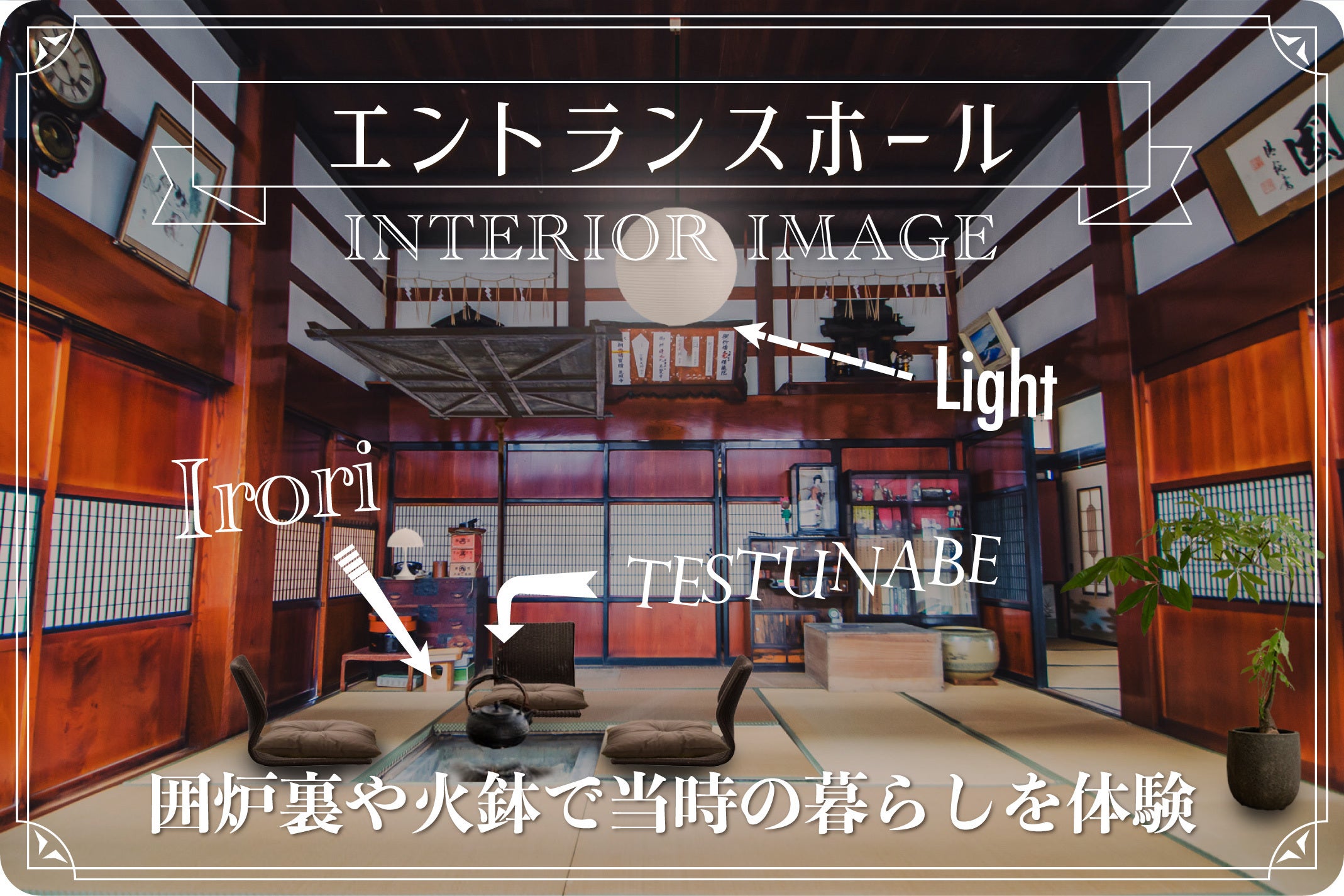 玄関引き戸を開けると目の前に広がる圧倒的迫力のエントランスホール。昔ながらの振り子時計や古い調度品、筆文字の額縁など、当時残されたままの姿で古き良き時代を表現しています。畳をめくると姿を現す囲炉裏を活かし、昔の暮らしを体験できる空間となります。