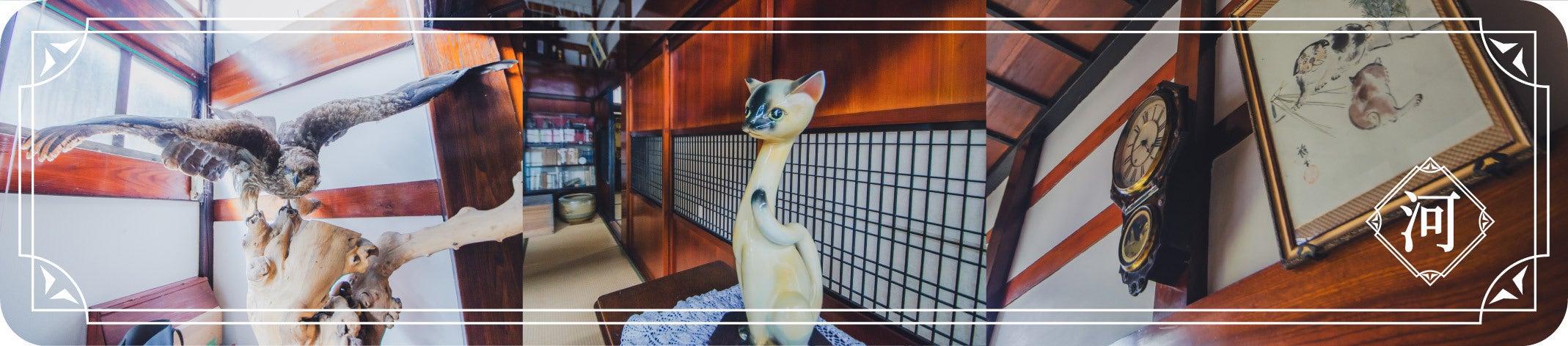 空き家にそのまま置いてあった調度品や置き物、掛け軸、レトロな雰囲気の食器などが素敵すぎたので、そのまま活かして使わせていただくことに。