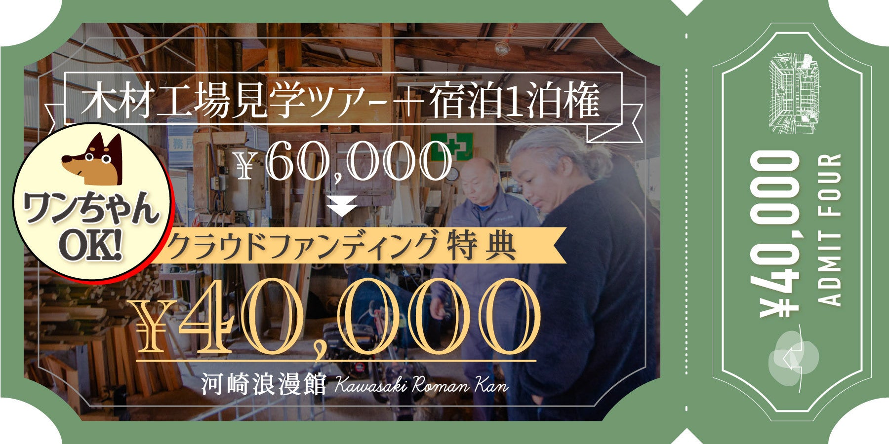 ●蔵サウナに使用している佐渡アテビを製材している木工工場見学ツアーと河崎浪漫館の宿泊1泊分の権利です ※1