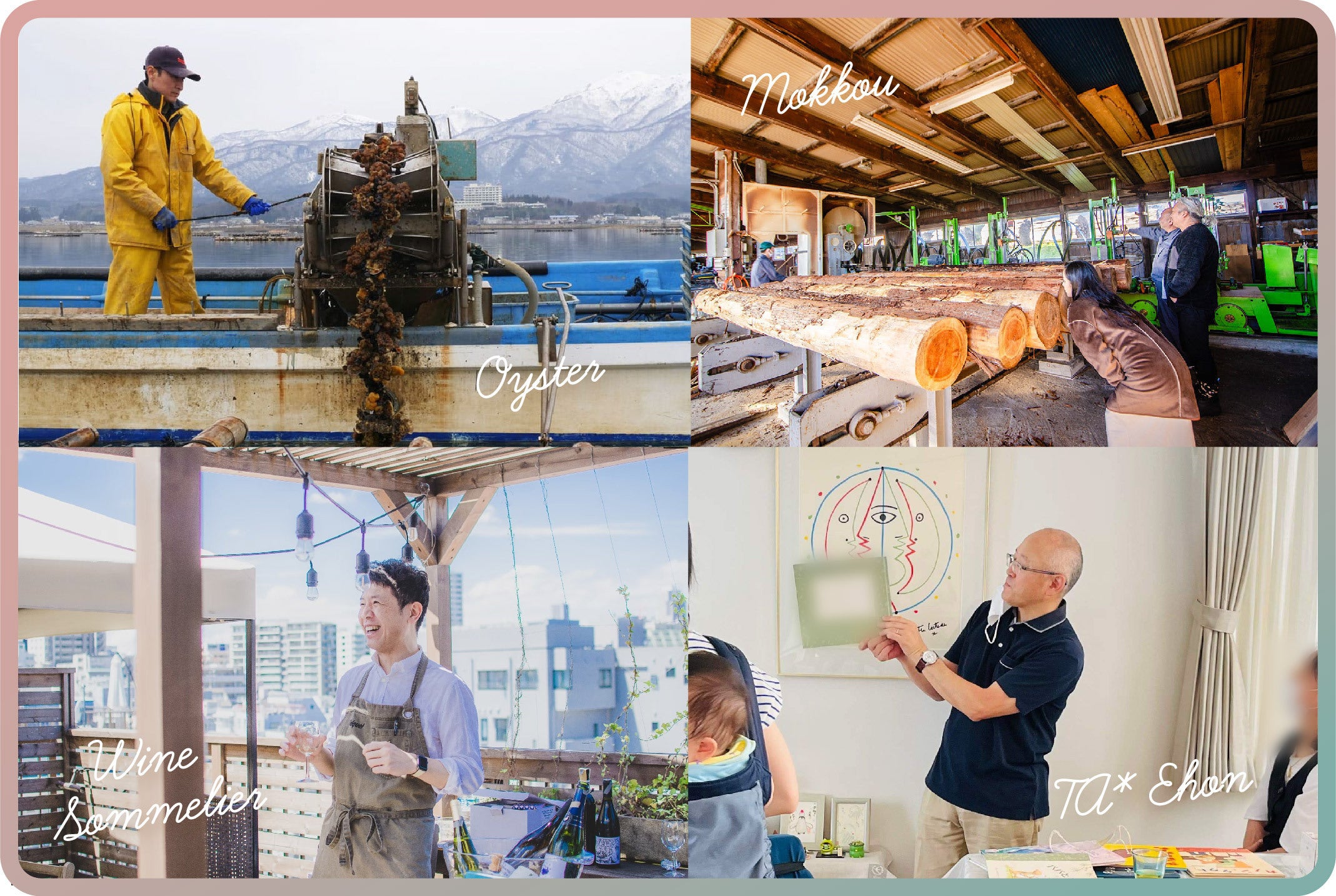 佐渡の町おこしをしたいという私たちの想いに共感していただいた佐渡の地元の飲食店様や工務店、牡蠣漁師の方、木材屋さんなど、多くの方に応援していただいております。