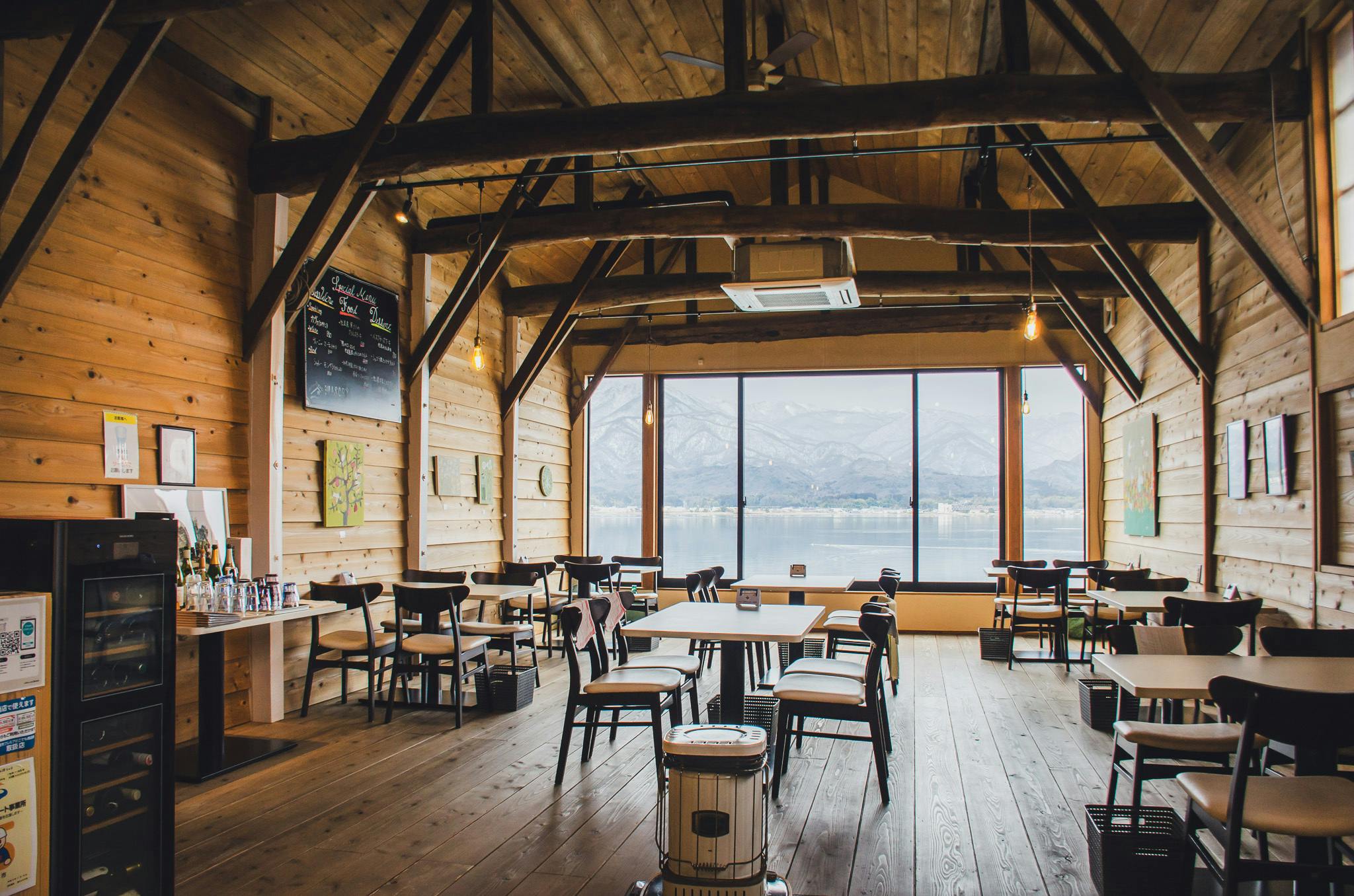 加茂湖のほとりの、船小屋でできたcaMoco cafe 湖ASOBi(加茂湖カフェこあそび)。築50年ほどの舟小屋を改装し、力強さを感じさせる天井の太いはりなどをそのまま生かしました。大きな窓から加茂湖を一望できる落ち着いた空間で、加茂湖で採れたカキを使ったパスタやサケのランチなど、地元産食材を活用した料理を提供しています。