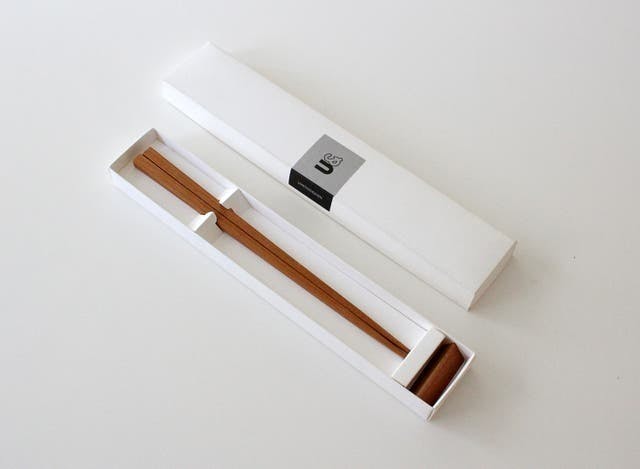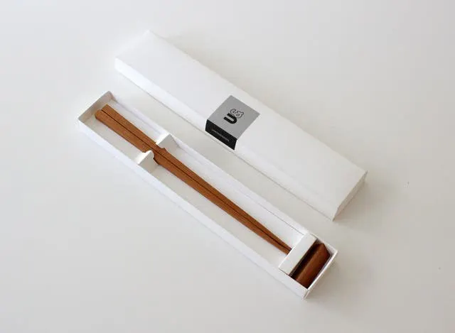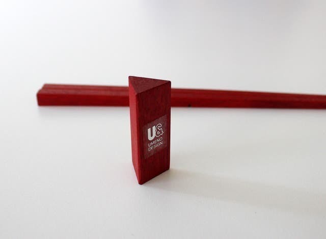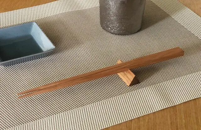三角形の箸置きと箸には多少の相性があります。ロゴシールを隠すようにテーブルに置くのをオススメしています。