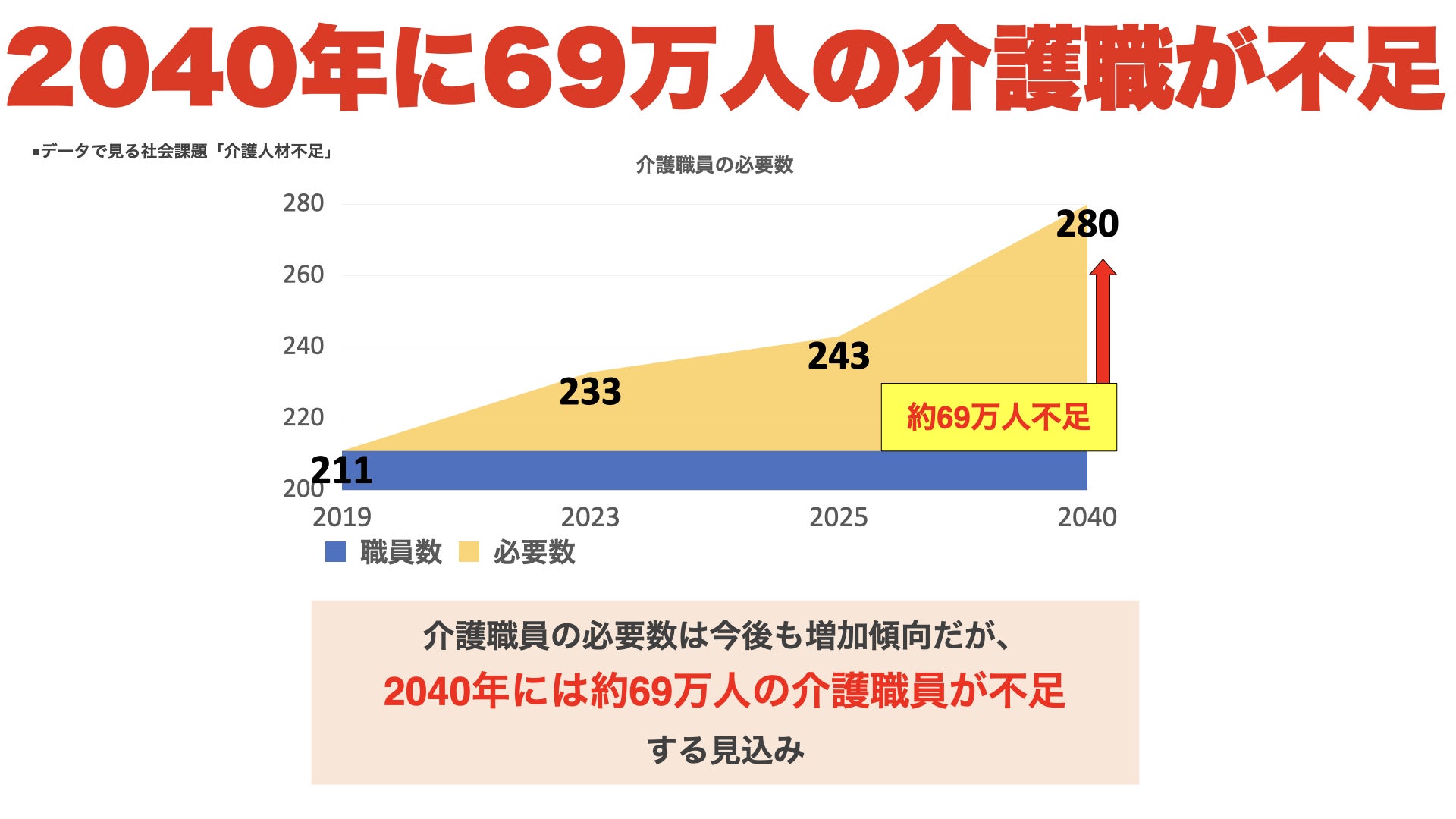 誰にでも訪れる可能性のあるそんな辛い現実。日本は今、超高齢社会と言われるようになり、どこかそれが当たり前のような社会の雰囲気になってきました。核家族化などにより若い世代が高齢者に接する機会が少なくなっている裏側で、介護などのサポートを必要とする高齢者の数は年々増えてきています。そのような方々が自分らしく尊厳を持って日常を送るために必要な介護職の数は、今この瞬間も大きく不足しています。2040年には69万人の介護職が不足するという試算もある中で、介護業界に入る入職者数から業界を離れた離職者数を差し引いた入職超過率が調査開始以降初のマイナスになったことが昨年報じられました。この記事をお読みのあなたにとっても、親が、配偶者が、子どもが、そしてあなた自身が、必要なサポートを受けられなくなるかもしれません。介護人材不足の問題は、決して高齢者だけに関わりのあることではなく、今すべての世代の方に知って頂きたいコトです。