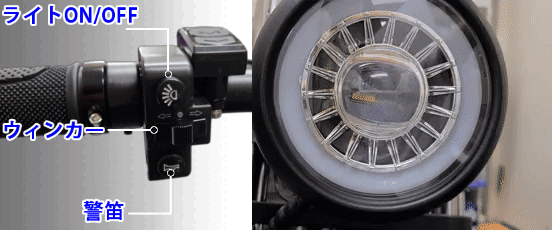 ボタン一つで明るく正面を照らしてくれるため、夜間のライドも安心です。