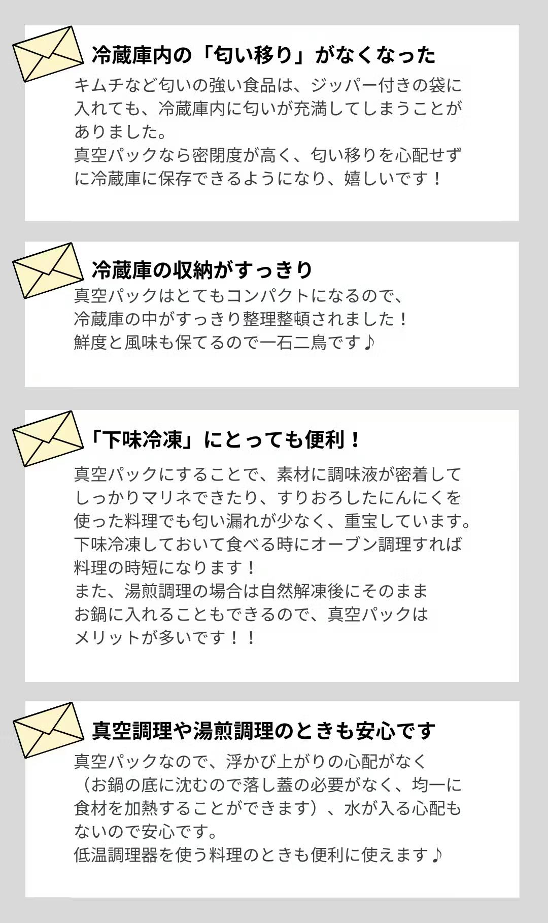真空パック保存なら、食感が悪くなったり、味が変化したり、匂いが発生することを防ぐことができるため、「美味しい」状態を長く保つことができます。