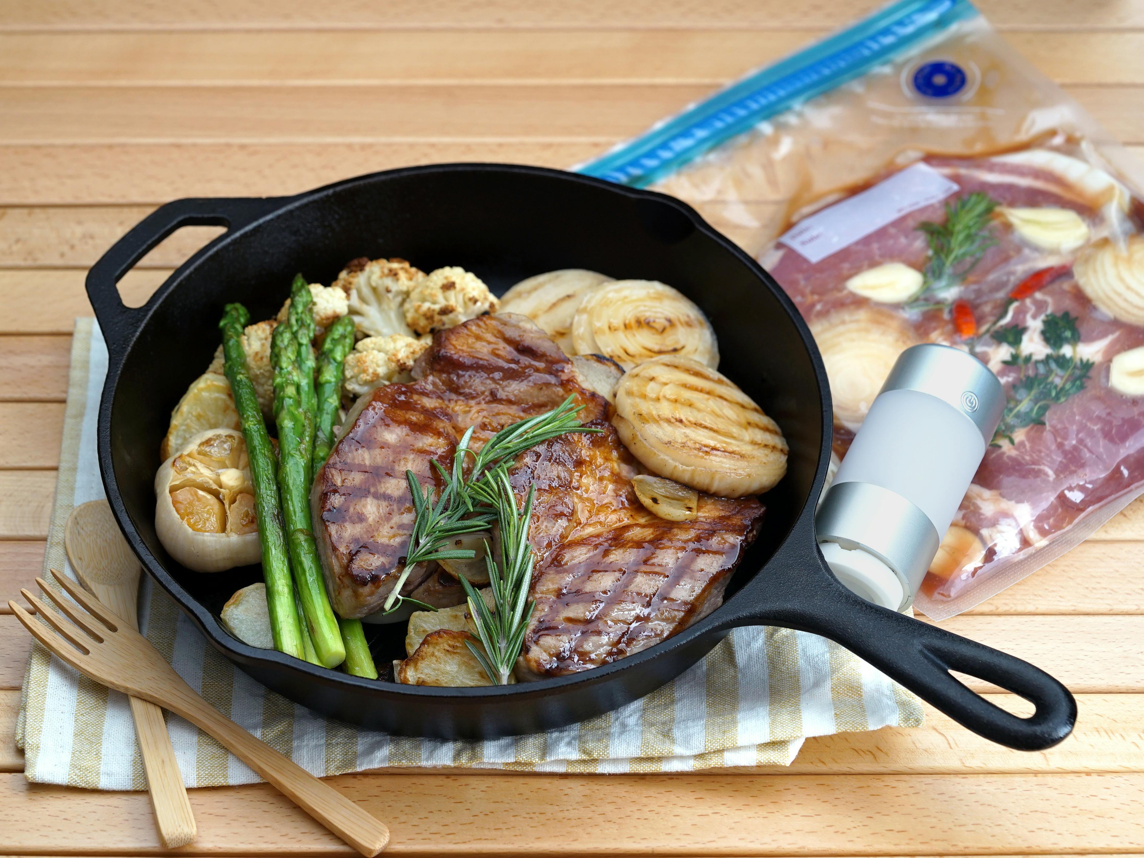 真空パック:厚切りのステーキ用豚肉、酒、みりん、しょうゆ、ニンニク等