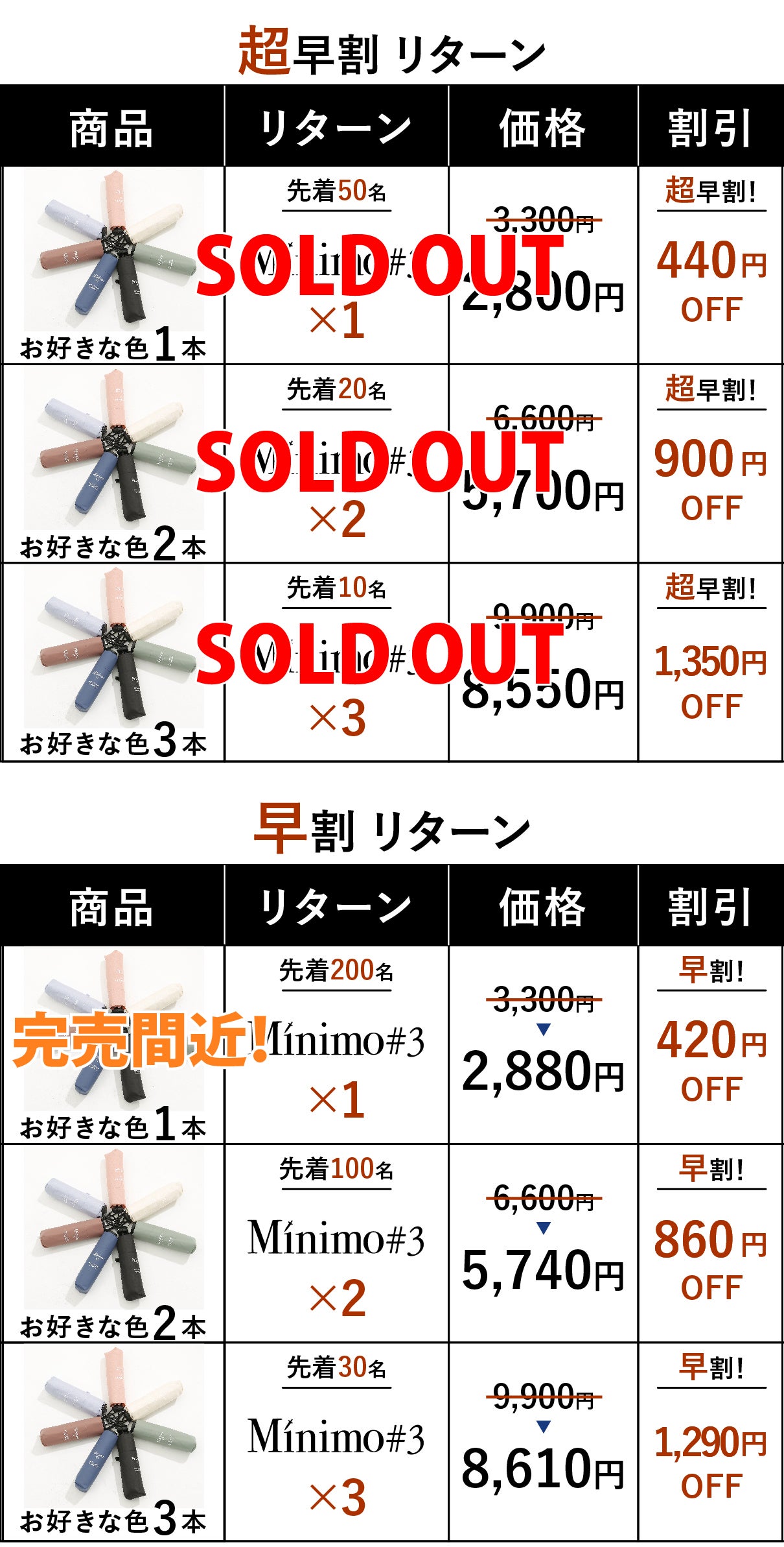 2025/02/07 11:28Minimo ユーザーの皆様Minimoの最新作#3.5がCAMPFIREに登場です!「超コンパクト折りたたみ傘 Minimoの最新作 #3.5は涼しさも抜群!」https://camp-fire.jp/projects/819470/view今回は、Minimo#3の骨をベースに、生地に遮熱効果(体感温度-7℃)をバッチリ持たせました!小ささ(16.5cm), 軽さ(150g), 細さ(4.5cm)の3拍子をそろえた完璧なコンパクト感に加え、ミニ傘にありがちな開閉の煩わしさもなく容易に開閉でき、日傘の遮熱性能(体感-7℃)もばっちりに備えた、5拍子揃えた超コンパクト晴雨兼用傘が誕生しました。Minimo#3からの+0.5の進化ポイントは、この「涼しさ」にあります。ご興味のある方は、ぜひ!インタービジネスブリッジ合同会社(IBB) もっと見る