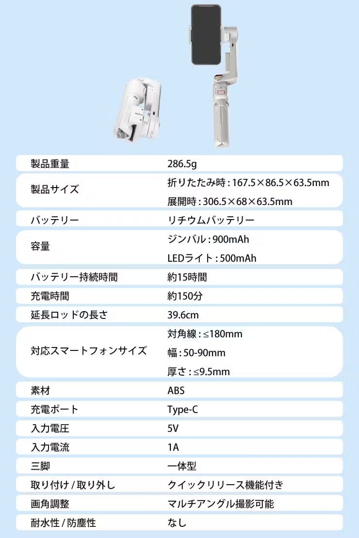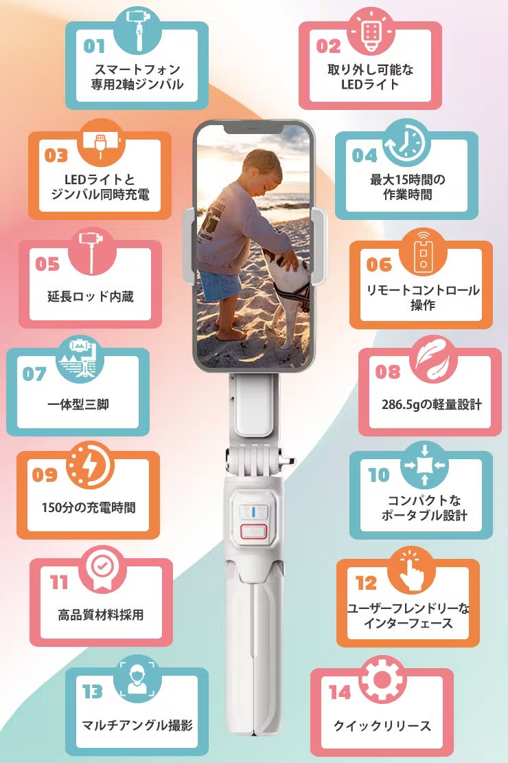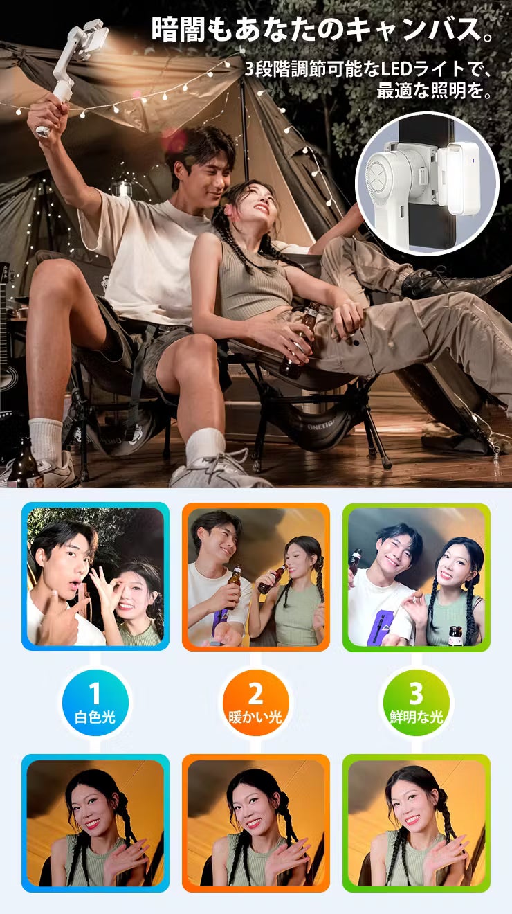 このジンバルはあなたのスマホをプロ並みのビデオカメラに変え、スムーズな映像撮影を可能にします。ジンバル技術と高品質なLEDライトを組み合わせることで、どんな状況でも最適な照明で撮影を行うことができる革新的なデバイスとなりました。