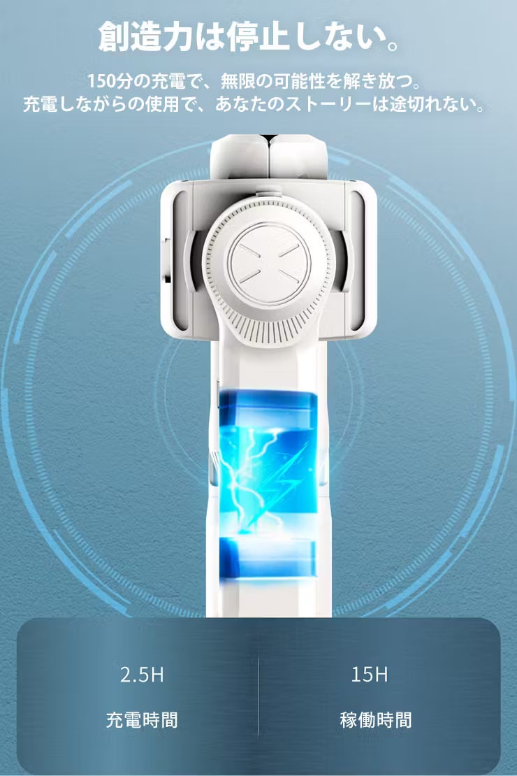 このジンバルはたったの150分でフル充電され、あなたの想像力とアイデアを途切れなくサポートします。