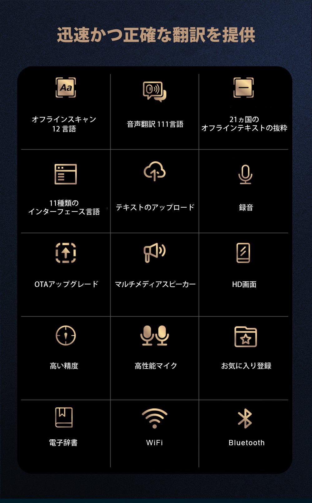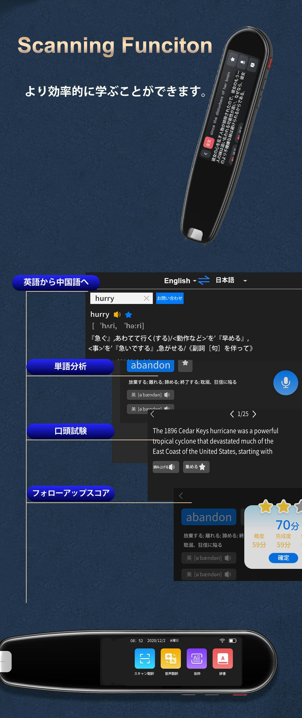シンプルな操作 : 高性能マイク、光学文字認識、電子辞書搭載など、使いやすさにもこだわりました。直感的な操作方法により、翻訳デバイスの利用がより簡単になります。
