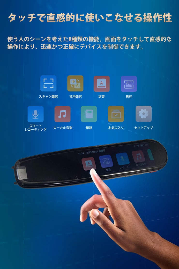 タッチパネル操作 : 直感的なタッチパネル操作により、翻訳や機能の切り替えが簡単に行えます。使いやすさと操作性を追求し、ストレスのないコミュニケーションを実現します。